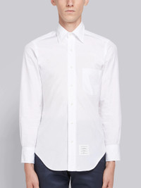 DETAILS & FIT White Shirt Solid Poplin Button-Down Long Sleeve Point Collar Thom Browne 4-Bar Tag Center-Back Locker Loop NOTES 100% Cotton Made in the USA MWL001A00906114