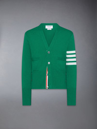 A signature Thom Browne emblem defines our Classic Cashmere 4-Bar V-neck Cardigan. Presented in 100% rich cashmere, this cardigan is a longstanding staple. V-neck Front button closure with striped grosgrain placket 4-bar stripe detail at left sleeve Buttoned side vents and cuffs with signature striped grosgrain trim Signature striped grosgrain loop tab at back of neck Model is 6' 1" (185cm), wearing size 1 100% Cashmere Made in the UK MKC001A-00011-300