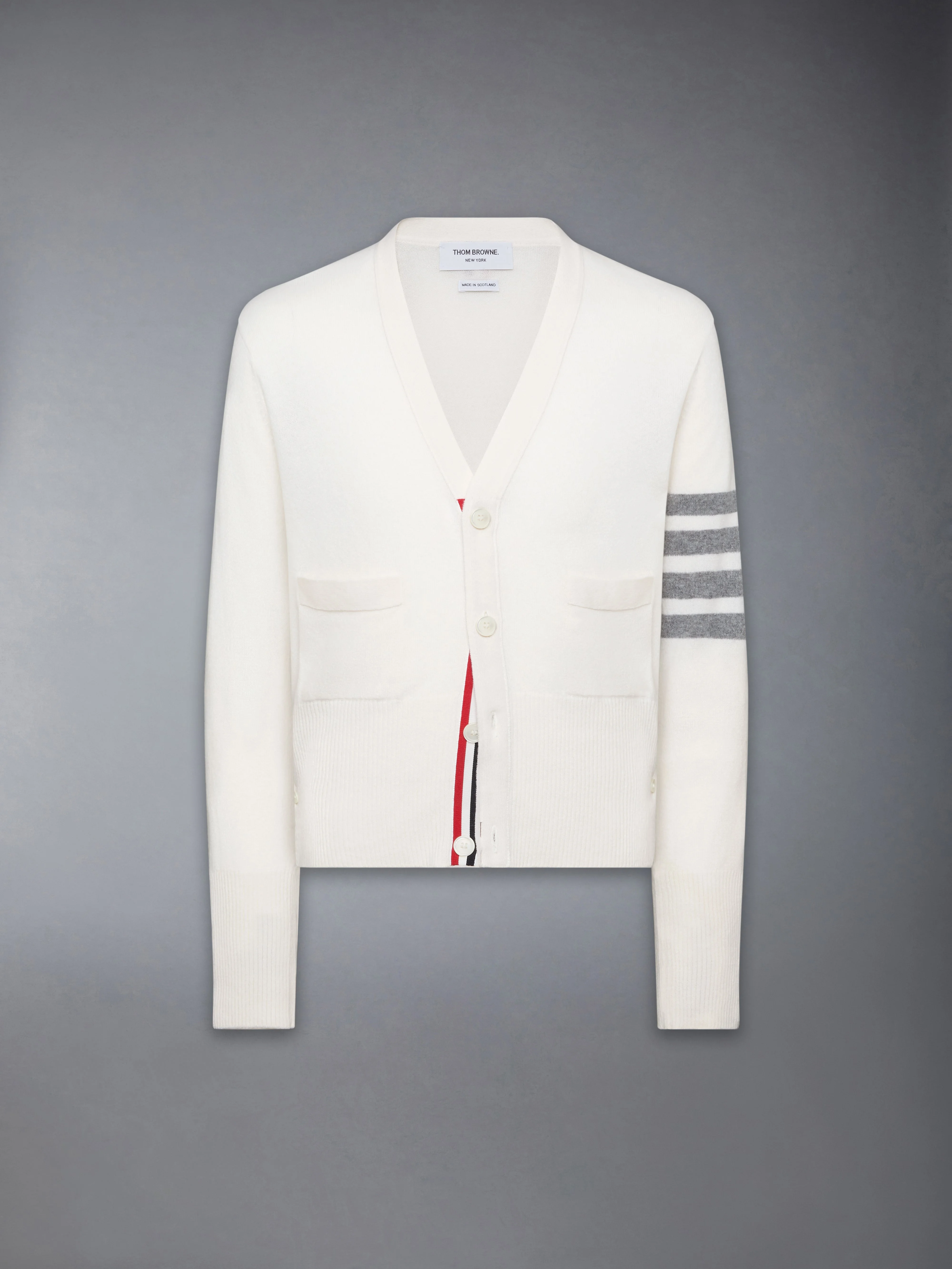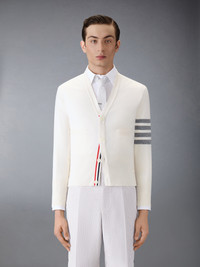 A signature Thom Browne emblem defines our Classic Cashmere 4-Bar V-neck Cardigan. Presented in 100% rich cashmere, this cardigan is a longstanding staple. V-neck Front button closure with striped grosgrain placket 4-bar stripe detail at left sleeve Buttoned side vents and cuffs with signature striped grosgrain trim Signature striped grosgrain loop tab at back of neck Model is 6' 1" (185cm), wearing size 1 100% Cashmere Made in the UK MKC001A-00011-100