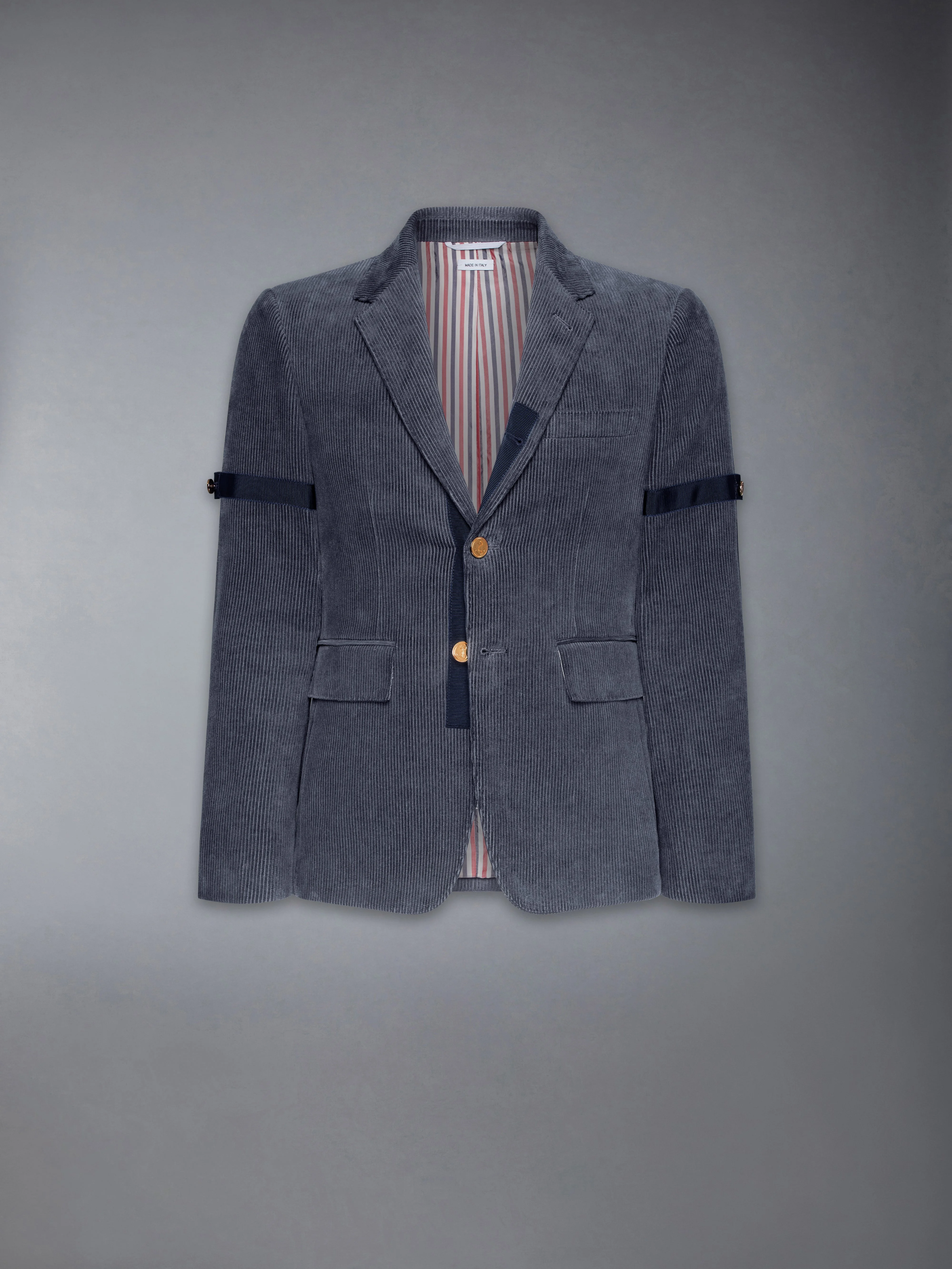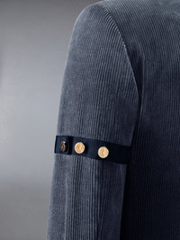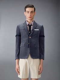 DETAILS & FIT This dapper sport coat exudes Thom Browne's mastery of innovative design. Featuring crisp tailoring and a rich navy color, this piece will serve as a staple in your wardrobe for years to come. Front button closure 2 Front flap pockets Single chest pocket Grosgrain armbands Interior pocket and name tag Signature striped grosgrain loop tabs Model is 6'1" (185cm), wearing size 1 100% Cotton Lining: 100% Cupro Made in Italy MJC001O-F0220-415