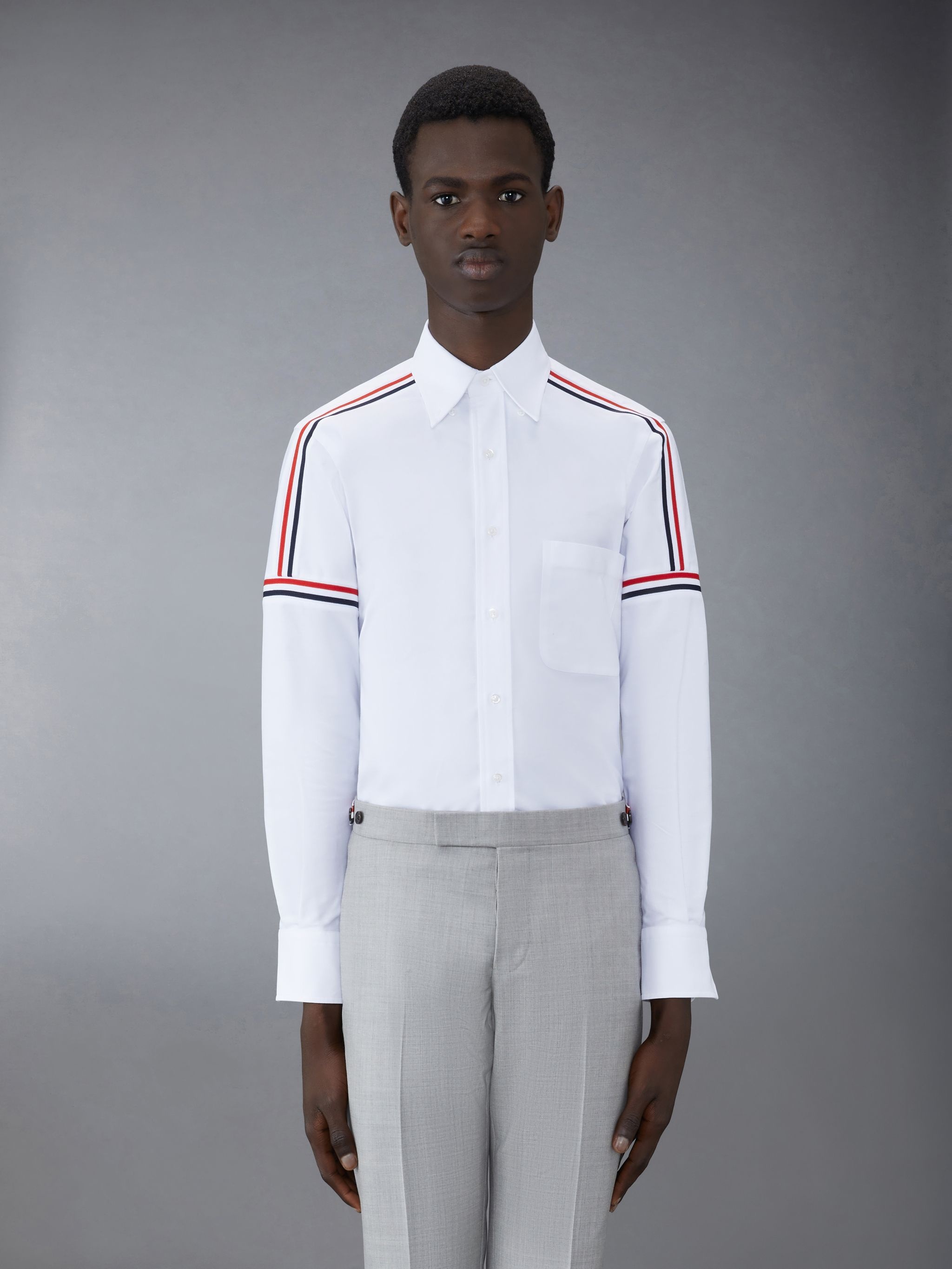 DETAILS & FIT A Thom Browne essential, our Oxford Elastic Shirt exhibits quality craftsmanship and meticulous tailoring. Button front closure Single Patch pocket Striped grosgrain trim extended armbands Name tag applique above hem Seamed back yoke with locker loop Signature striped grosgrain loop tab at back of neck Model is 6' 1" (185cm), wearing size 1 100% Cotton Made in Italy MWL270A-F0313-100