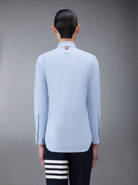 A Thom Browne essential, our Oxford Classic Point Collar Shirt exemplifies Thom Browne's signature inventive proportions and quality craftsmanship. Front button closure Button down point collar Patch chest pocket Name tag applique above curved hem Buttoned cuffs Signature striped grosgrain loop tab at back of neck Model is 6' 1" (185cm), wearing size 1 100% Cotton Made in Italy MWL001A-F0313-480