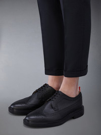 DETAILS & FIT Crafted with the highest quality of classic shoemaking, our Pebble Grain Longwing Brogue is a staple in Thom Browne's legacy. Features an elongated toe, lightweight rubber sole, and streamlined silhouette. Lace up closure Perforated broguing throughout Lightweight Tonal rubber sole Leather insole and lining Signature striped grosgrain loop tabs at heels Upper: 100% Calf Leather Sole: 100% Rubber Lining: 100% Calf Leather Made in Italy MFD002H-00198-001