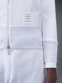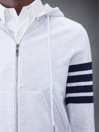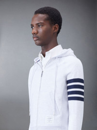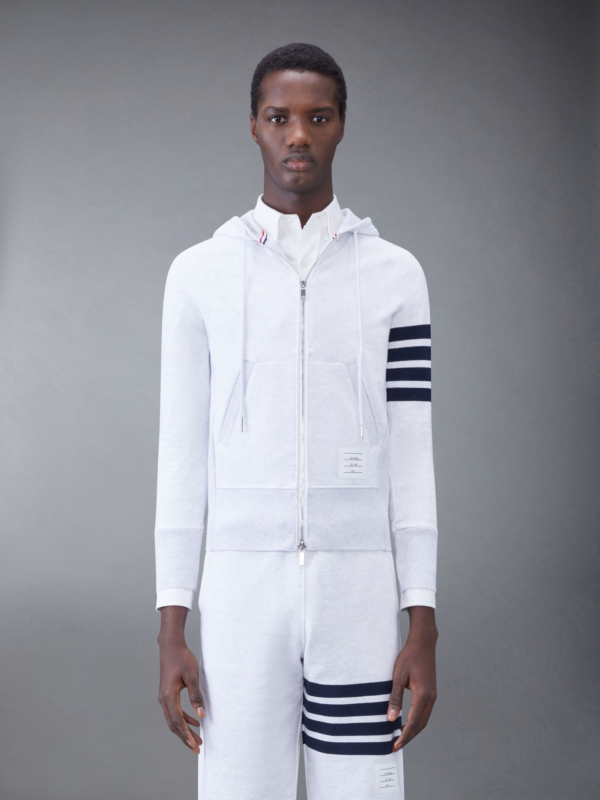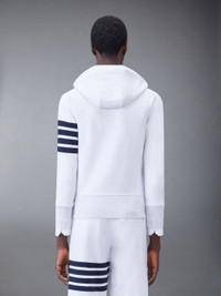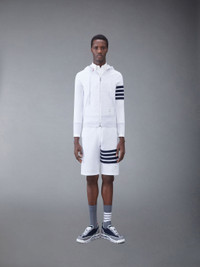 DETAILS & FIT Full zip hoodie sweatshirt in white classic loopback with 4-bar stripe detail at left sleeve in navy. 2-way front zip closure, pieced drawstring hood, bisected front kangaroo pocket. Buttoned cuffs with signature striped grosgrain trim. Ribbed detailing at hood, cuffs, and hem. Signature striped grosgrain loop tab at back of neck. Model is 6' 1" (185cm), wearing size 0. 100% Cotton Made in Japan MJT022H00535118