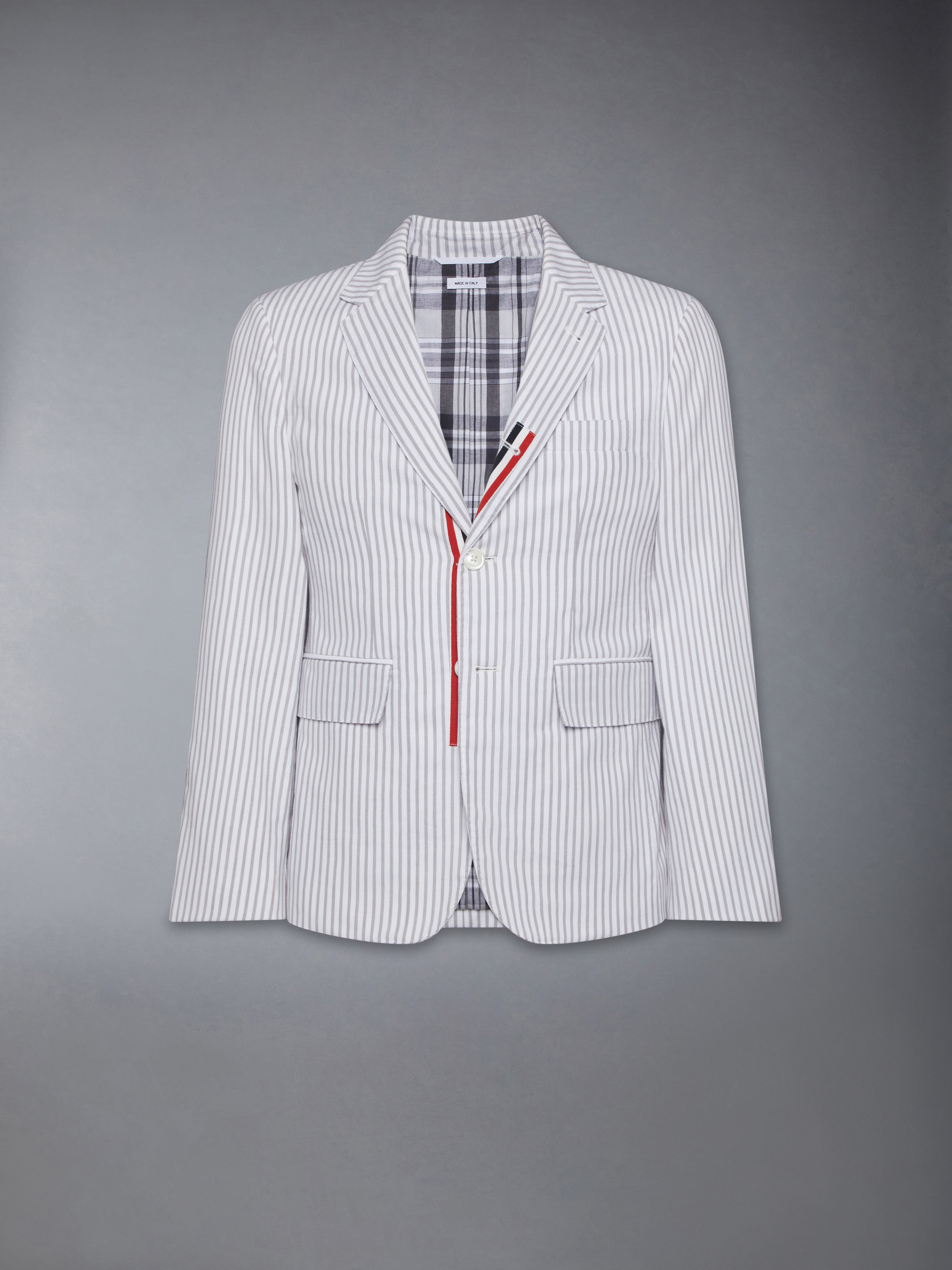 This dapper sport coat exudes Thom Browne's mastery of innovative design. Featuring crisp tailoring and a breezy madras fabric, this piece will serve as a staple in your spring wardrobe for years to come. Front button closure with striped grosgrain placket 2 Front flap pockets Single chest pocket Interior pocket with name tag Model is 6'1" (185cm), wearing size 1 100% Cotton Lining: 100% Cotton Lining 2: 100% Cupro Made in Italy MJC001O-F0810-035