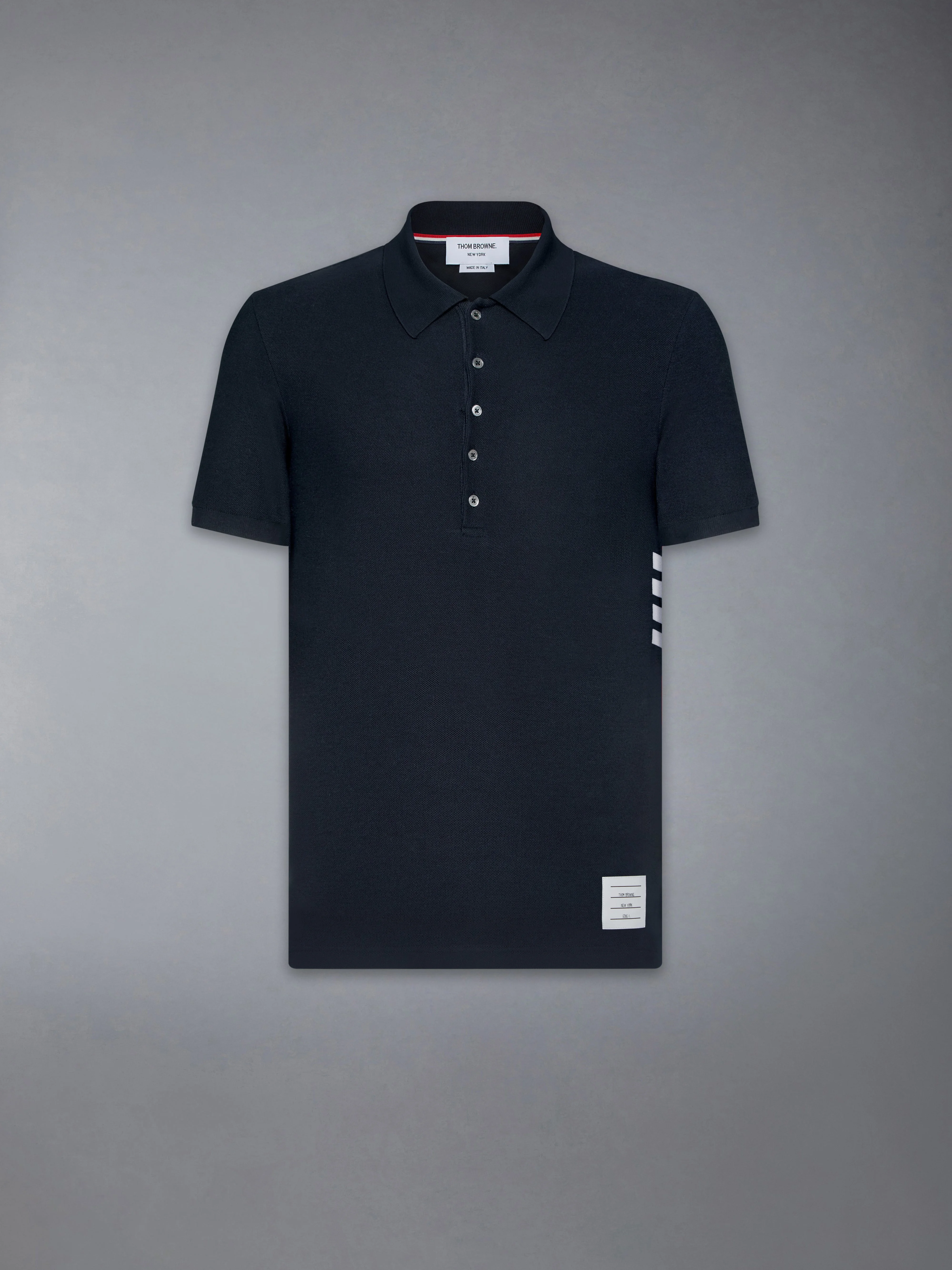 DETAILS & FIT Inspired by East Coast preppy icons, our Classic Pique 4-Bar Polo is a sophisticated take on a classic silhouette. Partial front button placket 4-bar detailing Name tag applique Signature striped grosgrain loop tab Model is 6'1" (185cm), wearing size 1 100% Cotton Made in Italy MJP110P-00050-415