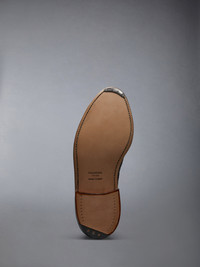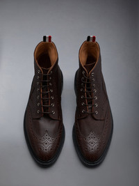 DETAILS & FIT Crafted with the highest quality of classic shoemaking, our Pebble Grain Wingtip Boot is a staple in Thom Browne's legacy. Features an elongated toe, rubber sole, and streamlined silhouette. Lace up closure at grommeted metal eyelets Perforated broguing throughout Tonal Goodyear leather sole Leather insole and lining Signature striped grosgrain loop tabs at heels Upper: 100% Calf Leather Sole: 100% Rubber Lining: 100% Calf Leather Made in Italy MFR016M-06549-210