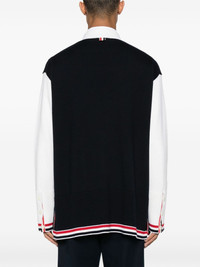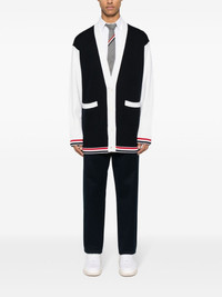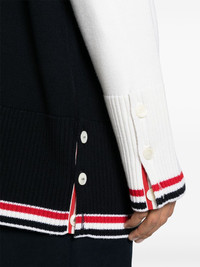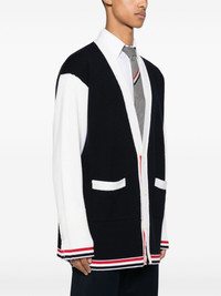 colourblock virgin-wool cardigan Highlights - Navy blue, ivory white - Virgin wool - Fisherman's knit - Colour-block panelled design - Plunging v-neck - Drop shoulder - Long sleeves with striped buttoned cuffs - Two front patch pockets - Unlined - Ribbed hem - Spare button - Front button placket Made in Italy Composition Virgin Wool 100% SIZE & FIT Model measurements Height 6 ft 2 in(1.87 m) Bust/Chest 38.18 in(97 cm) Hips 36.61 in(93 cm) Waist 29.13 in(74 cm) FittingInformation Designed for a regular fit, offering a comfortable loose fit throughout the body Made with a midweight knit, this piece offers some stretch This piece fits true to size – take your usual size Washing instructions Dry Clean Only