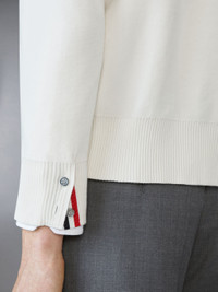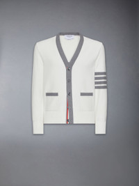 DETAILS & FIT Two signature Thom Browne emblems define this classic cardigan—iconic 4-Bar stripes and Hector detailing, both synonymous with the brand. Crafted from fine cotton, this cardigan is a timeless staple. V neckline Front button closure with striped grosgrain placket 2 Front slip pockets 4-bar detailing Buttoned cuffs with signature striped grosgrain trim Signature striped grosgrain loop tab Model is 6'1" (185cm), wearing size 1 100% Cotton Made in Italy MKC582A-Y3006-100