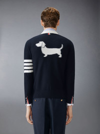 DETAILS & FIT Two signature Thom Browne emblems define this classic cardigan—iconic 4-Bar stripes and Hector detailing, both synonymous with the brand. Crafted from fine cotton, this cardigan is a timeless staple. V neckline Front button closure with striped grosgrain placket 2 Front slip pockets 4-bar detailing Buttoned cuffs with signature striped grosgrain trim Signature striped grosgrain loop tab Model is 6'1" (185cm), wearing size 1 100% Cotton Made in Italy MKC582A-Y3006-415
