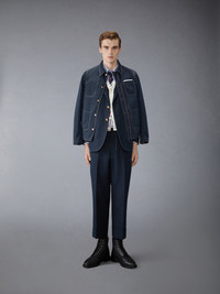 This dapper sport coat exudes Thom Browne's mastery of innovative design. Featuring crisp tailoring and a breezy cotton linen fabric, this piece will serve as a staple in your spring wardrobe for years to come. Front snap button closure 3 Front patch pockets Tricolor stripe lining Interior pocket with name tag Button cuffs with signature striped grosgrain trim Signature striped grosgrain loop tab Model is 6'1" (185cm), wearing size 1 55% Cotton, 45% Linen Lining: 100% Cupro Made in Japan MJU568S-F0829-415
