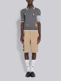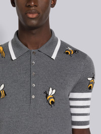 DETAILS & FIT Short sleeved polo in grey cotton merino with allover birds and bees intarsia and 4-bar stripe detail at left sleeve in white. Partial button placket, spread collar, stripe details at collar and hem. Buttoned side vents with signature striped grosgrain trim. Signature striped grosgrain loop tab at back of neck. Model is 6' 1" (185cm), wearing size 1. 90% Wool, 10% Cotton Made in Italy MKP083AY1002035