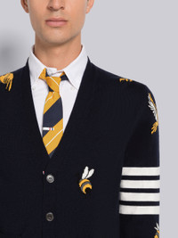 DETAILS & FIT V-neck cardigan in navy cotton Merino with allover birds and bees intarsia and 4-bar stripe detail at left sleeve in white. Front button closure with striped grosgrain placket. 2 slip front pockets. Buttoned side vents and cuffs with signature striped grosgrain trim. Signature striped grosgrain loop tab at back of neck. Model is 6' 1" (185cm), wearing size 1. 90% Wool, 10% Cotton Made in Italy MKC451AY1002415