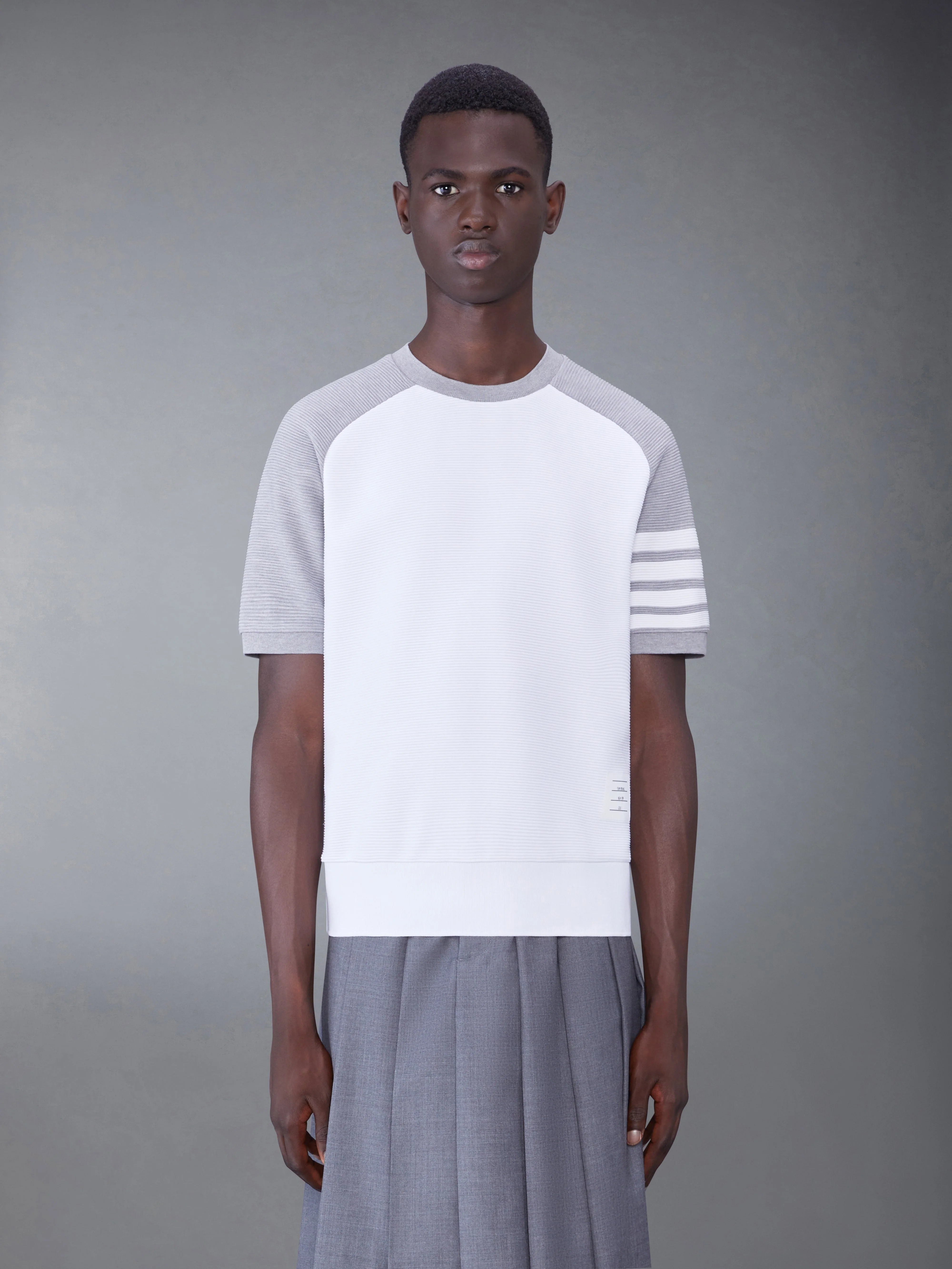 Short-sleeved sweatshirt in white cotton ottoman rib with light grey saddle sleeves and 4-bar stripe detail at left sleeve in white. Crew neckline. Name tag applique above hem. Signature striped grosgrain loop tab at back of neck. Model is 6' 1"; (185mm), wearing size 0. 100% Cotton MJT321A-08138-055
