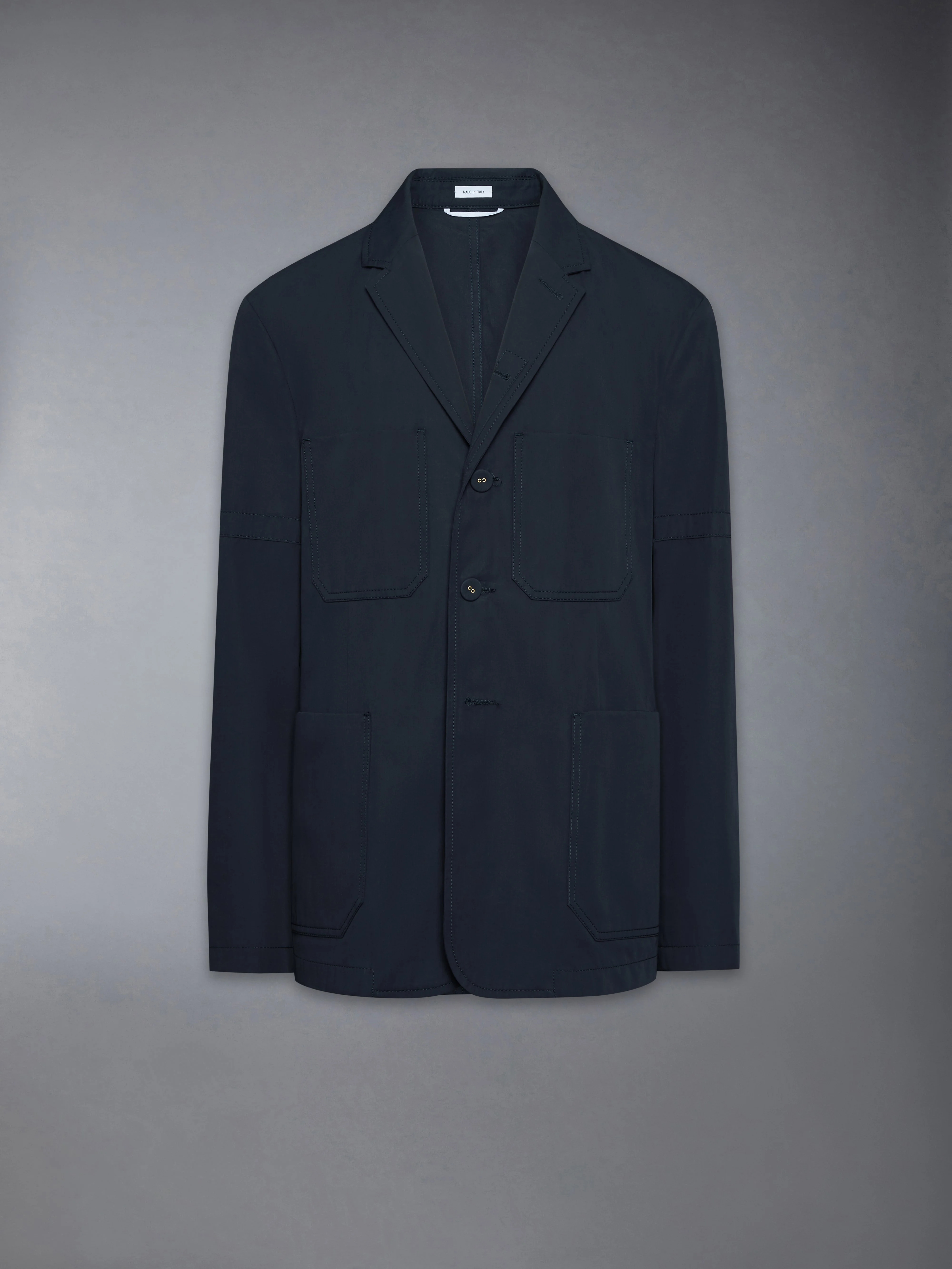 Utility meets precision in this unconstructed sport coat, cut in high-density typewriter cotton with a crisp, crease-resistant finish. A high-buttoning front reinforces the structured feel, while patch pockets nod to classic carpenter design and a cinching belt brings a tailored edge to the silhouette. Style with the Typewriter Cotton Belted Utility Trouser for a uniform grounded in function and ease. Front closure with self-covered buttons Patch chest and hand pockets Two interior pockets Button-fastening self armbands Buttoned cuffs with RWB grosgrain trim Self belt with buckle Smooth sleeve lining for easy on and off Signature striped grosgrain loop tab Model is 6'1" (185cm), wearing size 1 100% Cotton Lining: 100% Cupro Made in Italy MJU580A-F1063-415