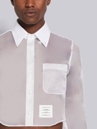 DETAILS & FIT Cropped straight fit shirt in sheer white satin organza with tonal shirting collar and cuffs. Front button closure, button-down point closure, patch chest pocket, name tag applique above rounded hem. Pleated back yoke with locker loop. Signature striped grosgrain loop tab at back of neck. 100% Silk Combo 1: 100% Cotton Made in Italy MWL383C08164100