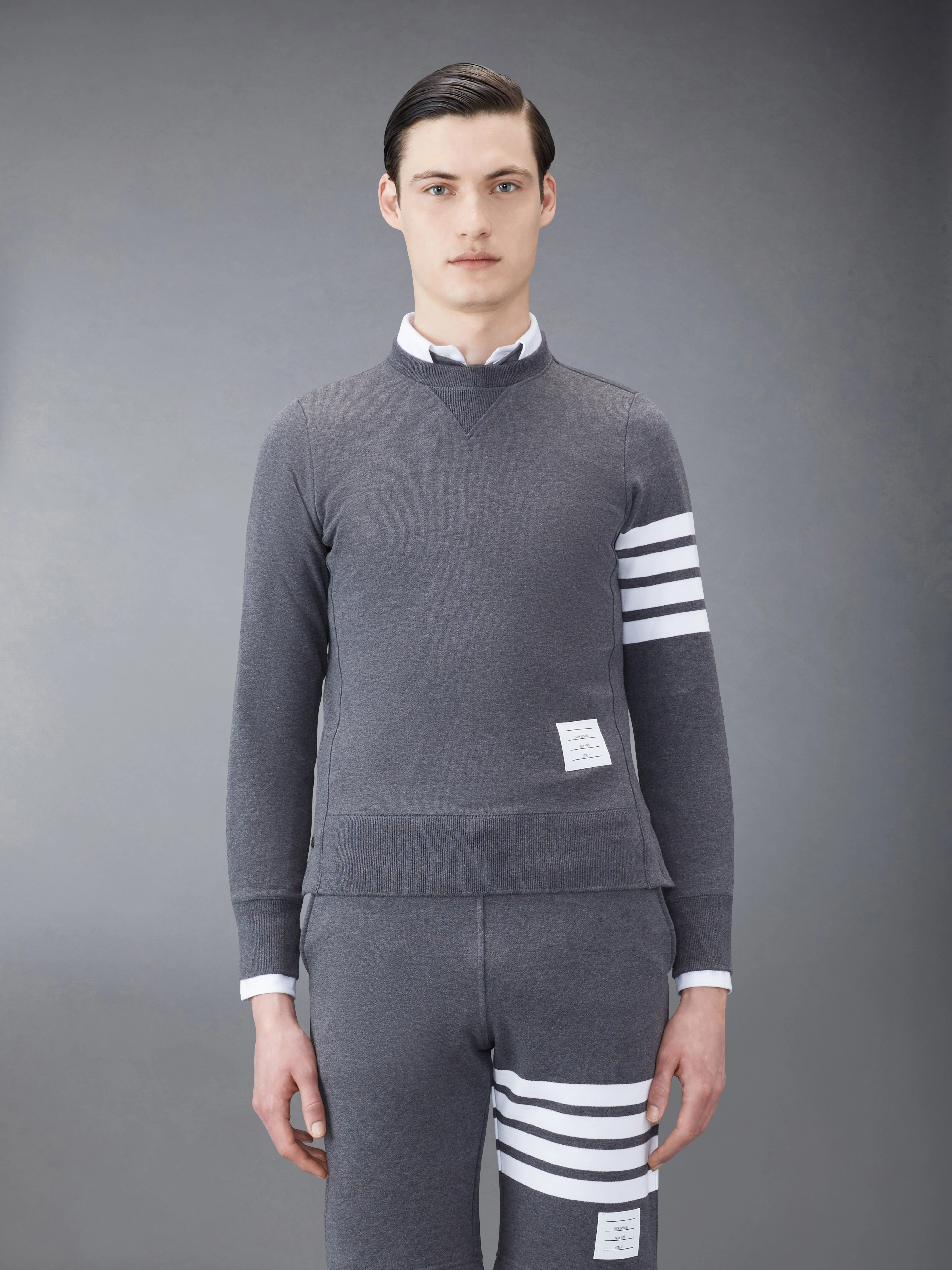 DETAILS & FIT Leisurewear made artful. Our Classic Loopback 4-Bar Sweatshirt is adorned with our iconic 4-Bar stripe detailing emulated after varsity stripes. Crew neckline with VPatch Engineered 4-bar stripe detail at left sleeve Name tag applique above hem Buttoned side vents with signature striped grosgrain trim Signature striped grosgrain loop tab at back of neck Model is 6' 1" (185cm), wearing size 0 100% Cotton Made in Japan MJT021H-00535-025 - CHEST: 100.0cm - SLEEVE LENGTH: 87.0cm - Shoulder Width: 42.0cm - WAIST: 94.0cm
