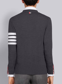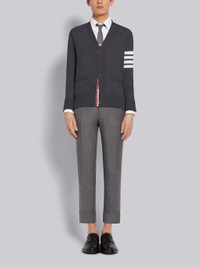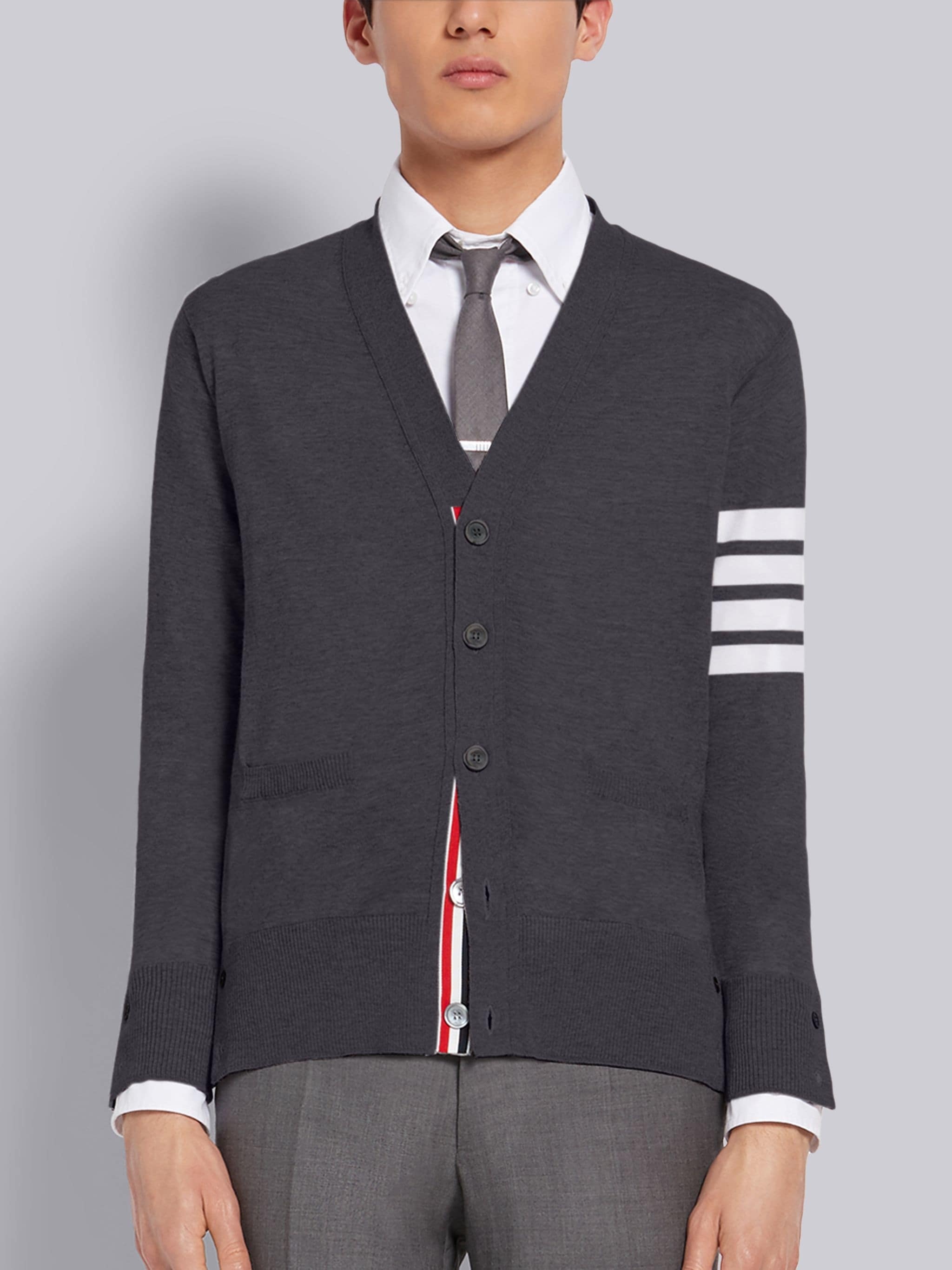 DETAILS & FIT A Thom Browne emblem defines our Wool Classic V-neck Cardigan — 4-Bar stripes. Presented in fine merino wool fabric, this cardigan is a classic that stands the test of time. V-neckline Front button closure with striped grosgrain placket 4-bar stripe detail at left sleeve Slip Front pockets Buttoned side vents and cuffs with signature striped grosgrain trim Signature striped grosgrain loop tab at back of neck Model is 6' 1" (185cm), wearing size 1 100% Virgin Wool Made in Italy MKC002A-Y1014-022