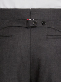 DETAILS & FIT Classic backstrap trouser in dark grey super 120s twill. Tab front closure, flat front, slip side pockets, button-fastening back welt pockets. Adjustable button-fastening backstrap. Creased legs. Signature striped grosgrain loop tab at back waist. Classic - Fit 1. Model is 6'1" (186 cm), wearing size 1 100% Wool Made in Italy MTC001A00626025