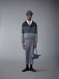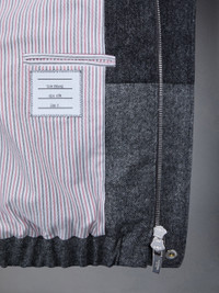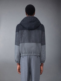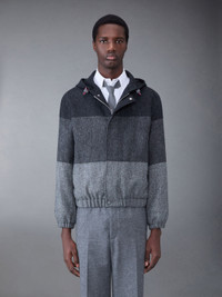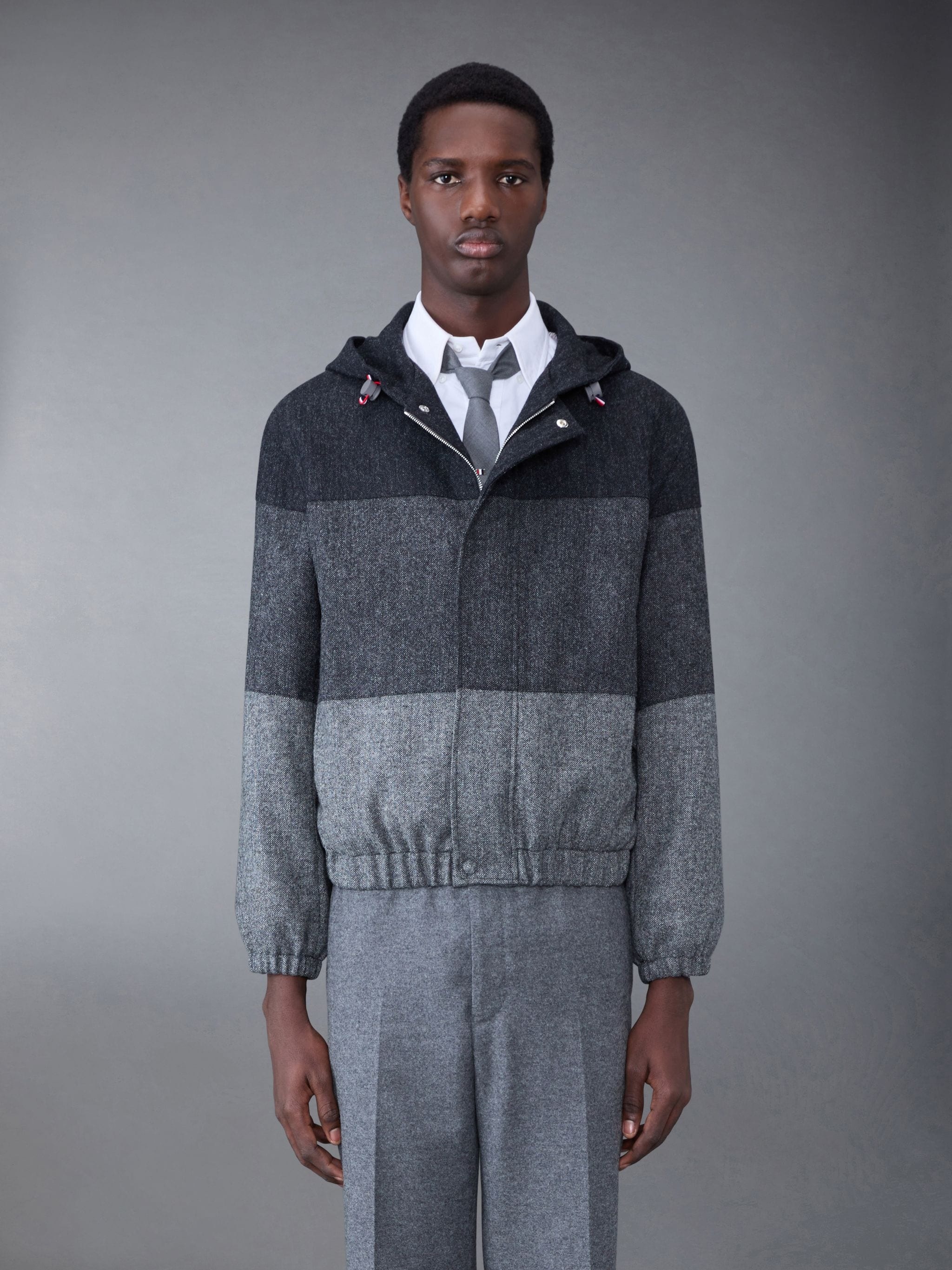 DETAILS & FIT Relaxed hooded zip jacket in tri-tone grey Donegal tweed. Covered zip front closure with snap button fastenings at neck and hem. Drawstring hood with multicolor cord and grey plastic stays. Gathered cuffs and hem. Slip side pockets. Striped lining with interior pocket and name tag. Signature striped grosgrain loop tab at back of neck. Model is 6' 1" (185cm), wearing size 0. 100% Wool Made in Italy MJO205A05385015