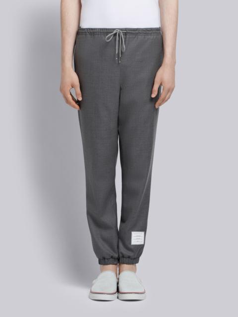 DETAILS & FIT Navy Track Trouser Super 120s Wool Twill Two Hip Pockets Elastic Hem Adjustable Drawstring Thom Browne 4-Bar Tag Signature Grosgrain Loop Tab Model is 6'1" (186 cm), wearing size 0. NOTES 100% Wool Made in Italy MTT011A00626415