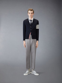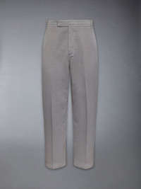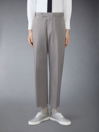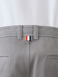 DETAILS & FIT A sophisticated trouser with a shortened hem that pays homage to Thom Browne’s distinguished tailoring. Breathable cotton fabric is a celebration of the season. Tab front closure Button-fastening back welt pockets Signature striped grosgrain loop tab Model is 6'1" (185cm), wearing size 1 100% Cotton Made in Italy MTU335W-F0576-035