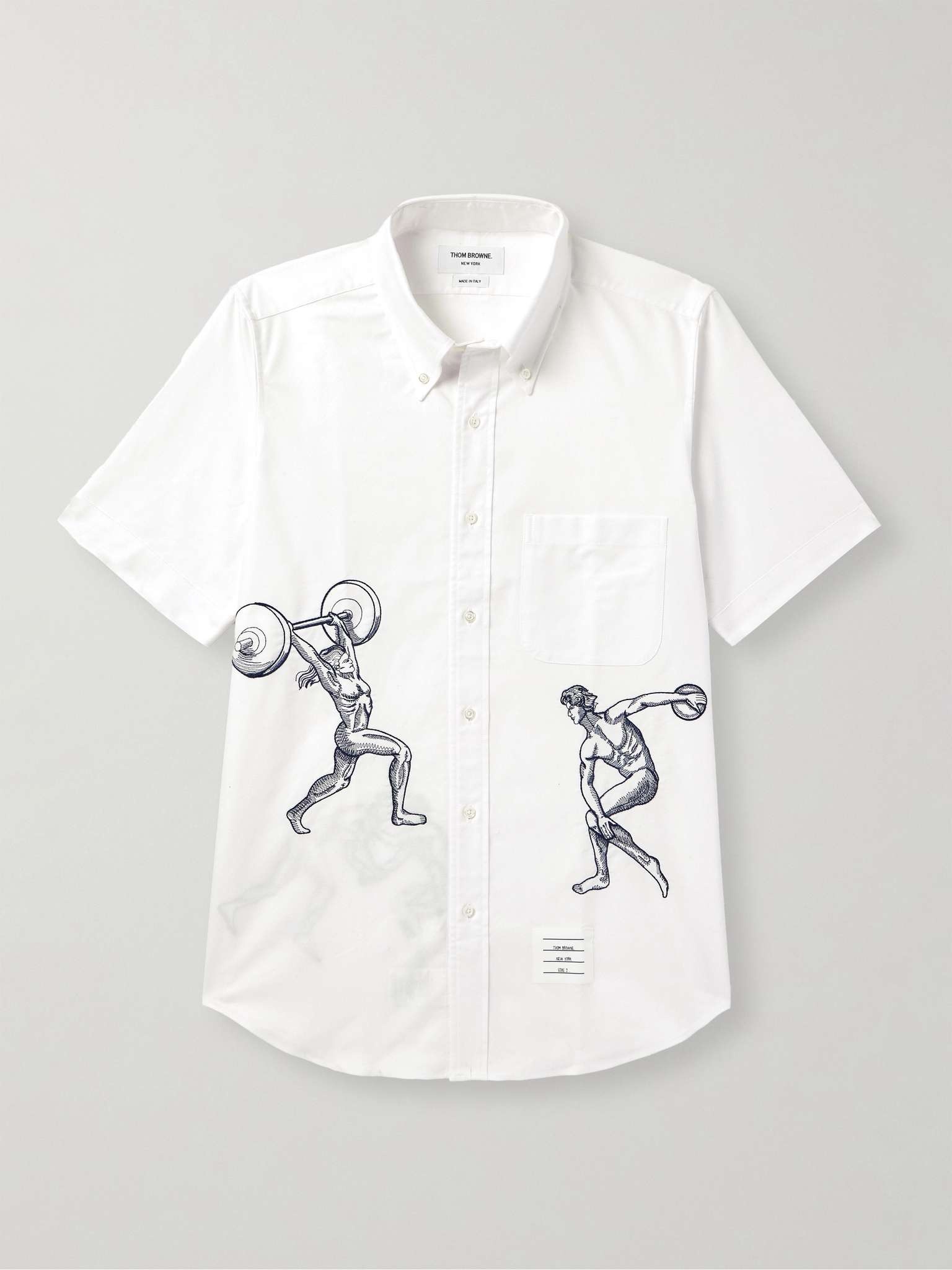Thom Browne's shirt is embroidered with athletes in sporting poses, inspired by his show at the Musee des Arts Decoratifs gallery in Paris. It's made from crisp cotton Oxford and has a neat button-down collar. Size & Fit - Size 0 = XS, 1 = S, 2 = M, 3 = L, 4 = XL, 5 = XXL and 6 = XXXL - Fits true to size. Take your normal size - Designed for a slightly loose fit - Lightweight, non-stretchy fabric - Model is shown wearing a 2 - Model measures: chest 38"/ 96cm, height 6'0"/ 183cm Details & Care - White cotton Oxford - Button fastenings - 100% cotton