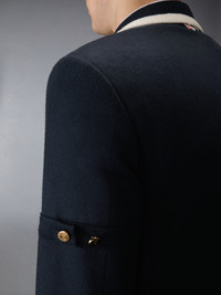 A study in relaxed formality, this unconstructed sport coat draws on the off-court and offshore influences that run through Thom Browne’s world. Crafted in zibeline-finish cashmere with wide shoulders and allover knit tipping, it features a hand-stitched bullion tennis racket applique and anchor-detailed buttons—nods to leisure traditions reimagined with tailored precision. Front closure with anchor-engraved buttons Contrast felt undercollar Welt chest pocket with hand-stitched bullion applique Flap hand pockets Three interior pockets Button-fastening self armbands Buttoned cuffs with RWB grosgrain trim Double back vent with internal RWB grosgrain and button connector Half Tricolor lining Signature striped grosgrain loop tab Wide shoulder fit Model is 6'1" (185cm), wearing size 1 100% Cashmere Combo 1: 100% Metal Lining: 100% Cupro Made in Italy MJC405E-05387-415