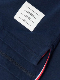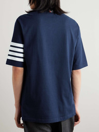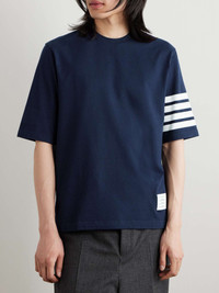 Thom Browne's T-shirt is printed with the label's signature '4-Bar' motif, which is inspired by varsity stripes. It's cut from lightweight cotton-jersey and has a classic crew neck. The brand's logo patch is stitched above the hem. Size & Fit - Size 0 = XS, 1 = S, 2 = M, 3 = L, 4 = XL, 5 = XXL and 6 = XXXL - Model wears a size larger to achieve a looser fit - Lightweight, slightly stretchy fabric - Model is shown wearing a 2 - Model measures: chest 36"/ 92cm, height 6'2"/ 188cm Details & Care - Navy and white cotton-jersey - 100% cotton - Hand wash