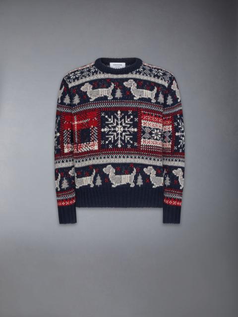 DETAILS & FIT Thom Browne's take on the classic holiday sweater, this piece is decked with playful Hector detailing and woven snowflakes. Crew neckline Signature striped grosgrain loop tab Model is 6'1" (185cm), wearing size 1 70% Wool, 30% Mohair Made in Italy MKA532A-Y1032-055