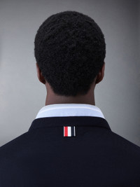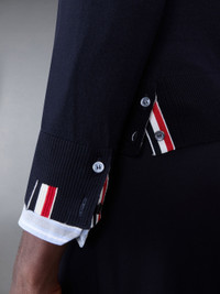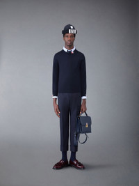 DETAILS & FIT Relaxed crew neck pullover in navy jersey stitch Merino with stripe detail at neckline and cuffs. Buttoned side vents and cuffs with signature striped grosgrain trim. Signature striped grosgrain loop tab at back of neck. Model is 6' 1" (185cm), wearing size 1. 99% Virgin Wool, 1% Polyamide Made in Italy MKA474AY1014415