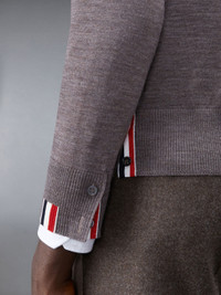 DETAILS & FIT Relaxed fit V-neck cardigan in fine Merino wool jersey with stripe detail at cuffs and neckline. Front button closure with striped grosgrain placket. 2 slip front pockets. Buttoned side vents and cuffs with signature striped grosgrain trim. Signature striped grosgrain loop tab at back of neck. Model is 6' 1" (185cm), wearing size 1. 99% Virgin Wool, 1% Polyamide Made in Italy MKC489AY1014211