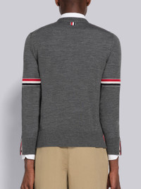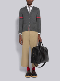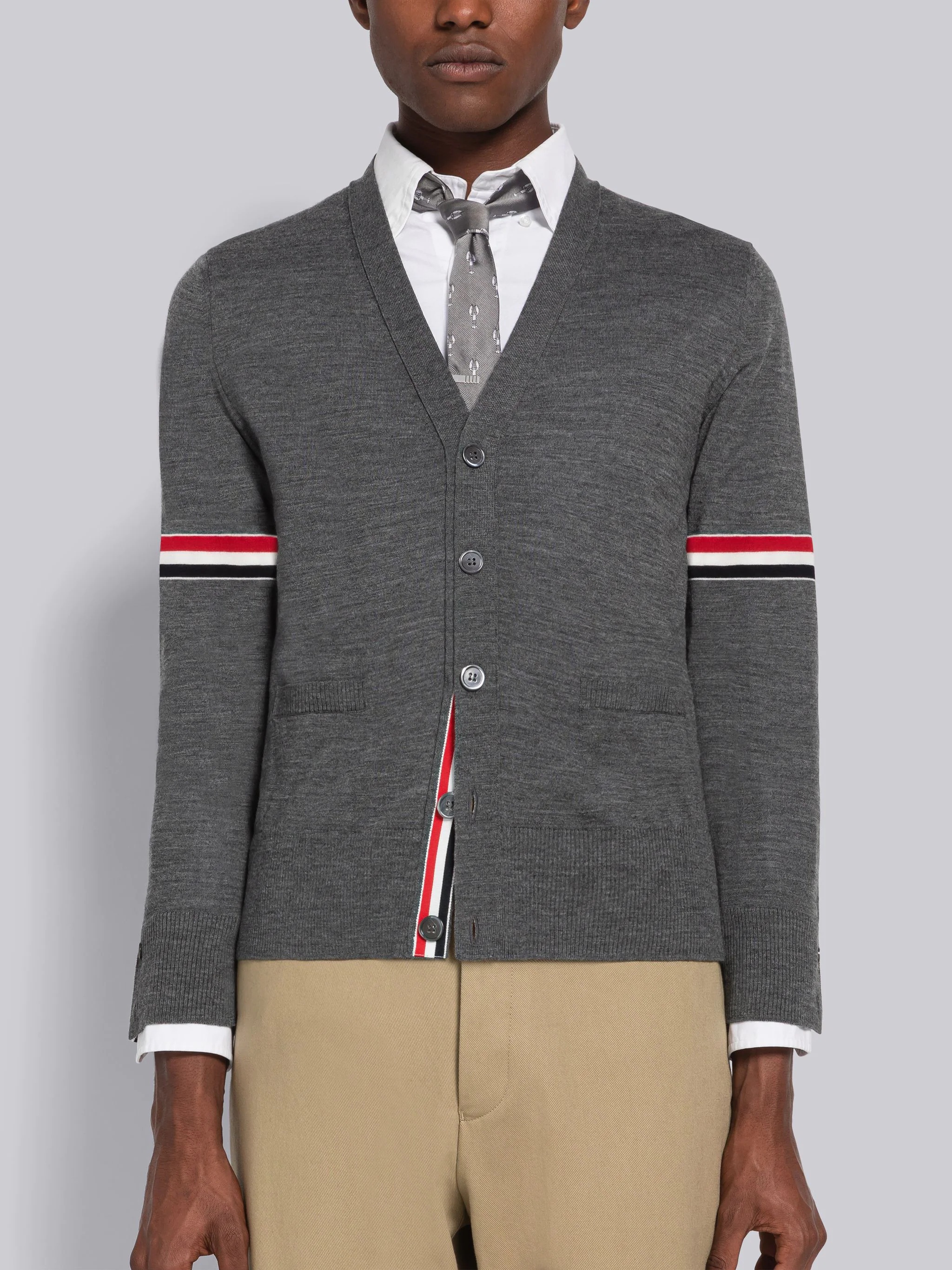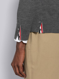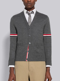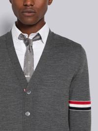 DETAILS & FIT Relaxed V-neck cardigan in medium grey jersey stitch Merino wool with stripe details at both sleeves. Front button closure with striped grosgrain placket. Buttoned side vents and cuffs with signature striped grosgrain trim. Ribbed cuffs and hem. Signature striped grosgrain loop tab at back of neck. Model is 6' 1" (185cm), wearing size .0 100% Virgin Wool Made in Italy MKC410AY1014035
