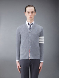 DETAILS & FIT High cut V-neck cardigan in waffle stitch fine Merino wool with 4-bar stripe detail at left sleeve in white. Front button closure with striped grosgrain placket, 2 slip front pockets. Signature striped grosgrain loop tab at back of neck. Model is 6' 1" (185cm), wearing size 1. 100% Virgin Wool Made in Italy MKC484AY1014055