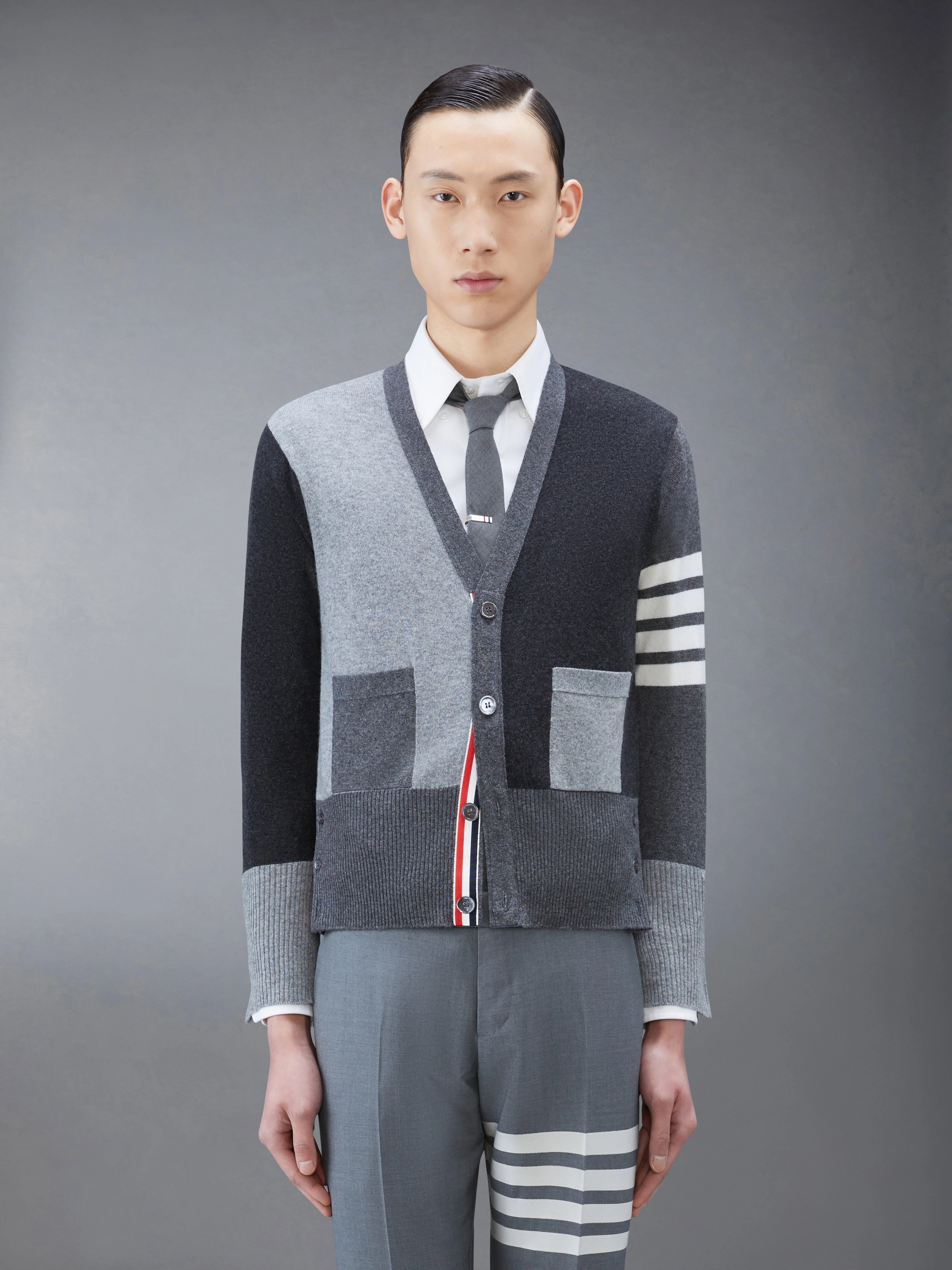 DETAILS & FIT Our Fun-Mix Cashmere 4-Bar V-neck Cardigan. Shades of rich cashmere are woven together in patchwork form amidst two signature Thom Browne emblems — 4-Bar stripes and grosgrain ribbon. V-neckline Front button closure with striped grosgrain placket 4-bar stripe detail at left sleeve Buttoned side vents and cuffs with signature striped grosgrain trim Signature striped grosgrain loop tab at back of neck Model is 6' 1" (185cm), wearing size 1 100% Cashmere Made in Great Britain MKC001F-00011-982