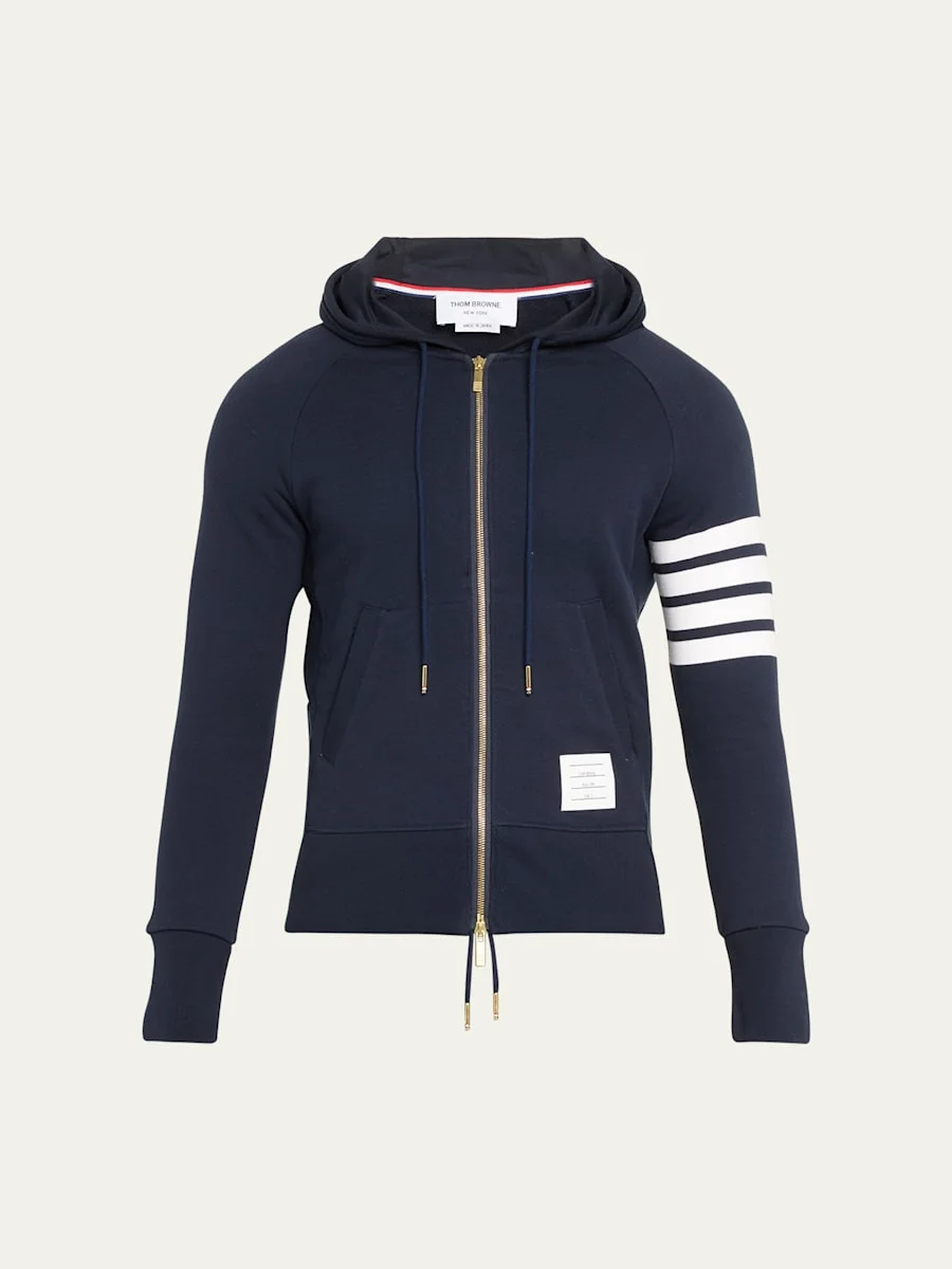 Thom Browne hoodie with signature stripe at sleeve. Approx. length: 21"L from shoulder to hem, 33"L down center back. Hooded collar; fullzip front. Split kangaroo pockets; logo patch at left side. Ribbed cuffs and hem. Cotton. Imported.