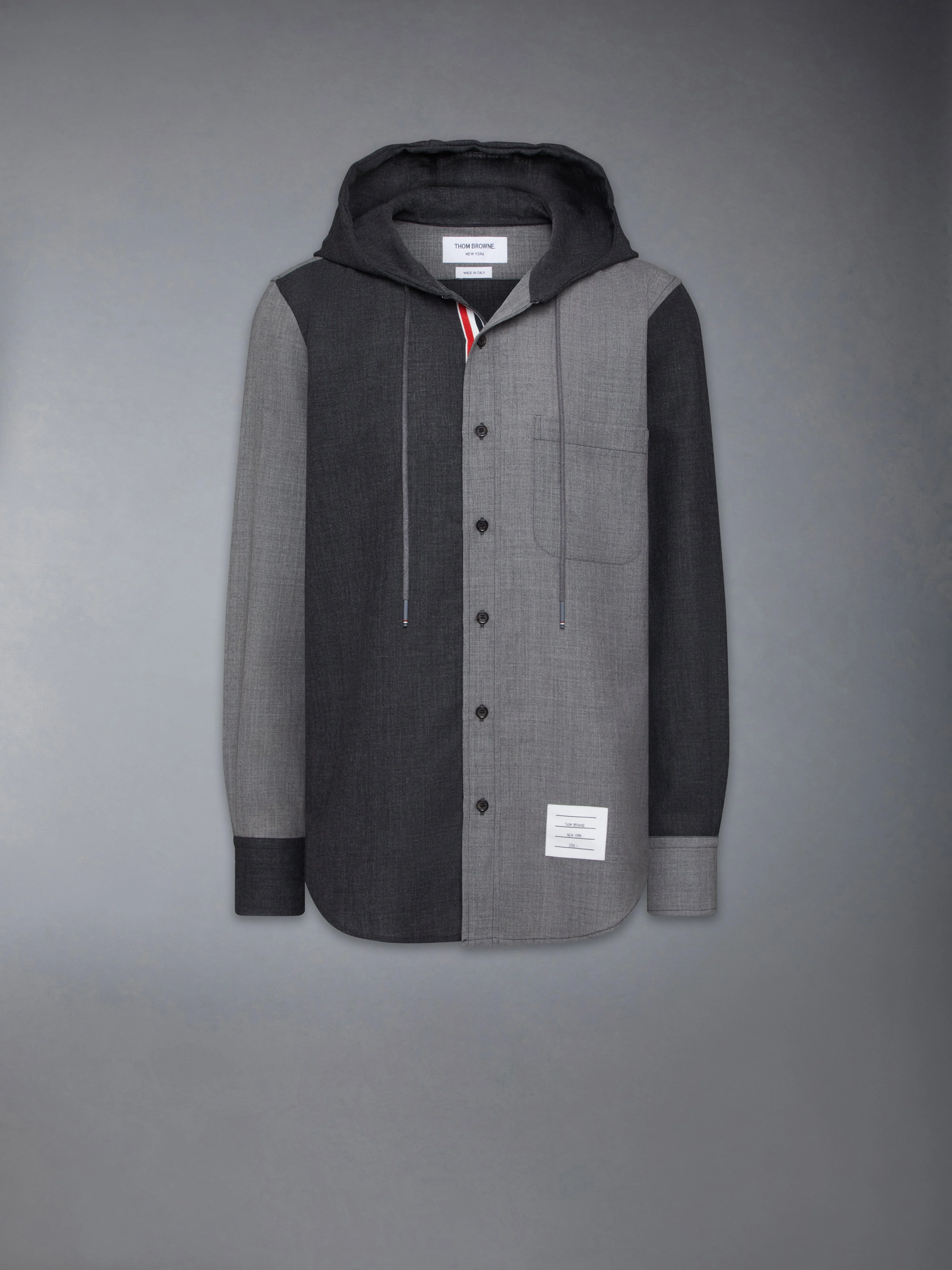 The perfect balance of elevated luxury and casual comfort, this two-tone shirt redefines spring layering. Equipped with a hood, it's lightweight yet protective, offering just the right level of defense against fall showers while keeping you effortlessly polished—a true statement in versatility. Front button closure with striped grosgrain placket Chest patch pocket Name tag applique Buttoned cuffs with signature striped grosgrain trim Model is 6'1" (185cm), wearing size 1 100% Cotton Made in Italy MWL419F-00473-982