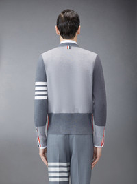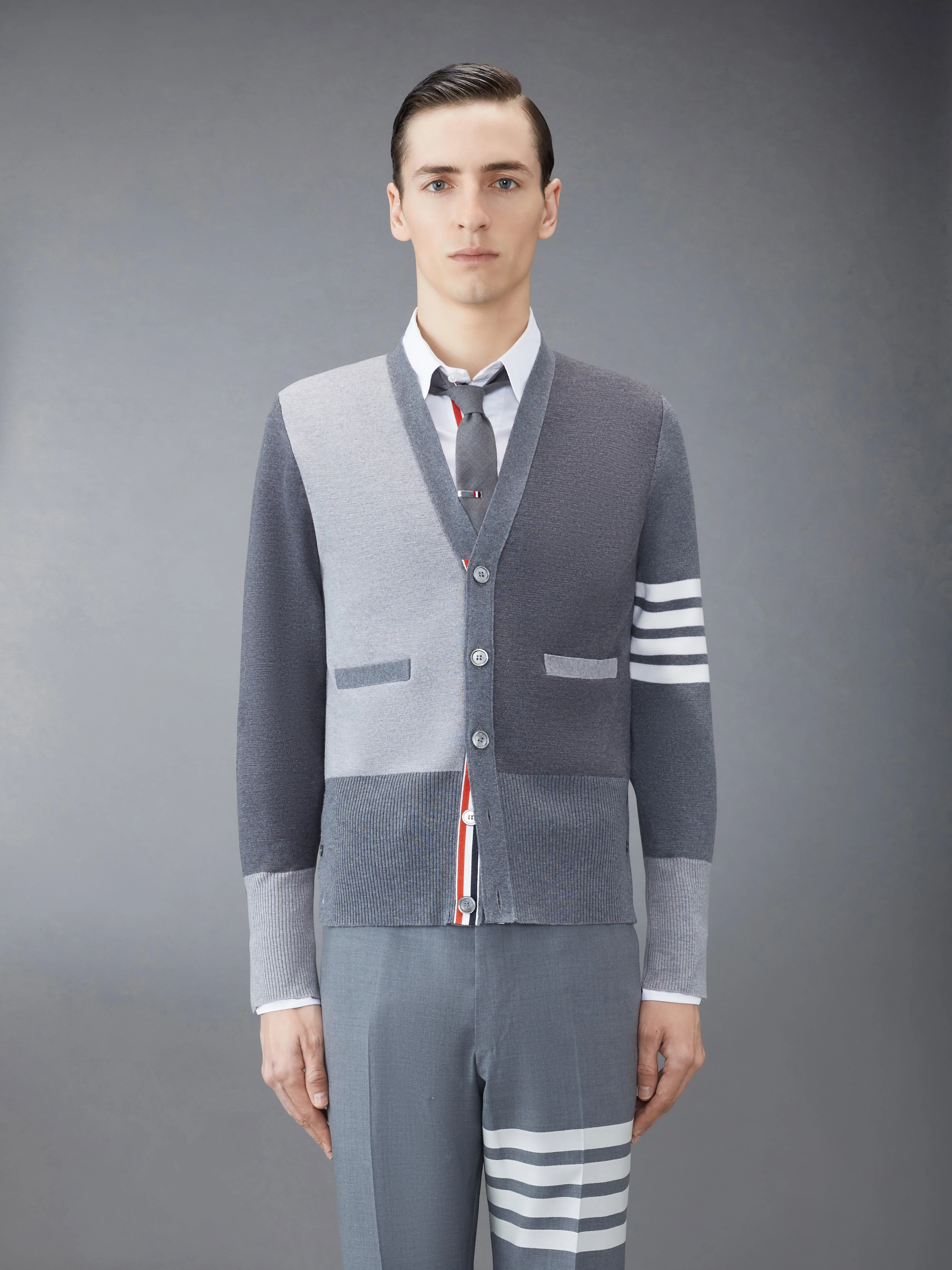 DETAILS & FIT Our Fun-Mix Wool V-neck Cardigan. Shades of virgin wool are woven together in patchwork form amidst two signature Thom Browne emblems — 4-Bar stripes and grosgrain ribbon. V-neckline Front button closure with striped grosgrain placket 4-bar stripe detail at left sleeve 2 front slip pockets Name tag applique above hem Signature striped grosgrain loop tab at back of neck Model is 6' 1" (185cm), wearing size 1 100% Virgin Wool Made in Italy MKC160F-00014-982