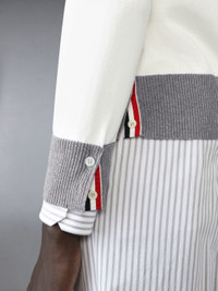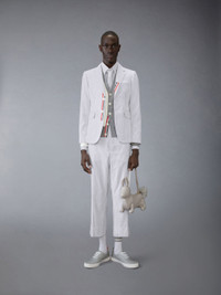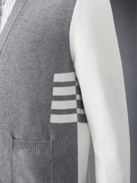 DETAILS & FIT A buildable layer that adds a touch of sophistication to any shirt underneath. V neckline Front button closure with striped grosgrain placket 4-bar detailing Buttoned side vents with signature striped grosgrain trim Buttoned cuffs with signature striped grosgrain trim Signature striped grosgrain loop tab Model is 6'1" (185cm), wearing size 1 100% Cotton Made in Italy MKC581F-Y3043-136