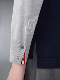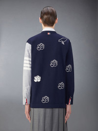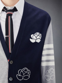 DETAILS & FIT An elegant cardigan with whimsical rose and raven details — a tribute to Edgar Allan Poe, whose poem "The Raven" served as inspiration for the Fall/Winter 2024 collection. Like Poe's works, this garment demands a closer look, ever-revealing unexpected juxtapositions that defy expectations. Layer this cardigan over a dress shirt or tee on cool fall days and nights. V neckline Front button closure with striped grosgrain placket Slip front pockets 4-bar detailing Buttoned cuffs with signature striped grosgrain trim Side vents Signature striped grosgrain loop tab Model is 6' 1" (185cm), wearing size 1 100% Cotton Made in Italy MKC544F-Y3040-989