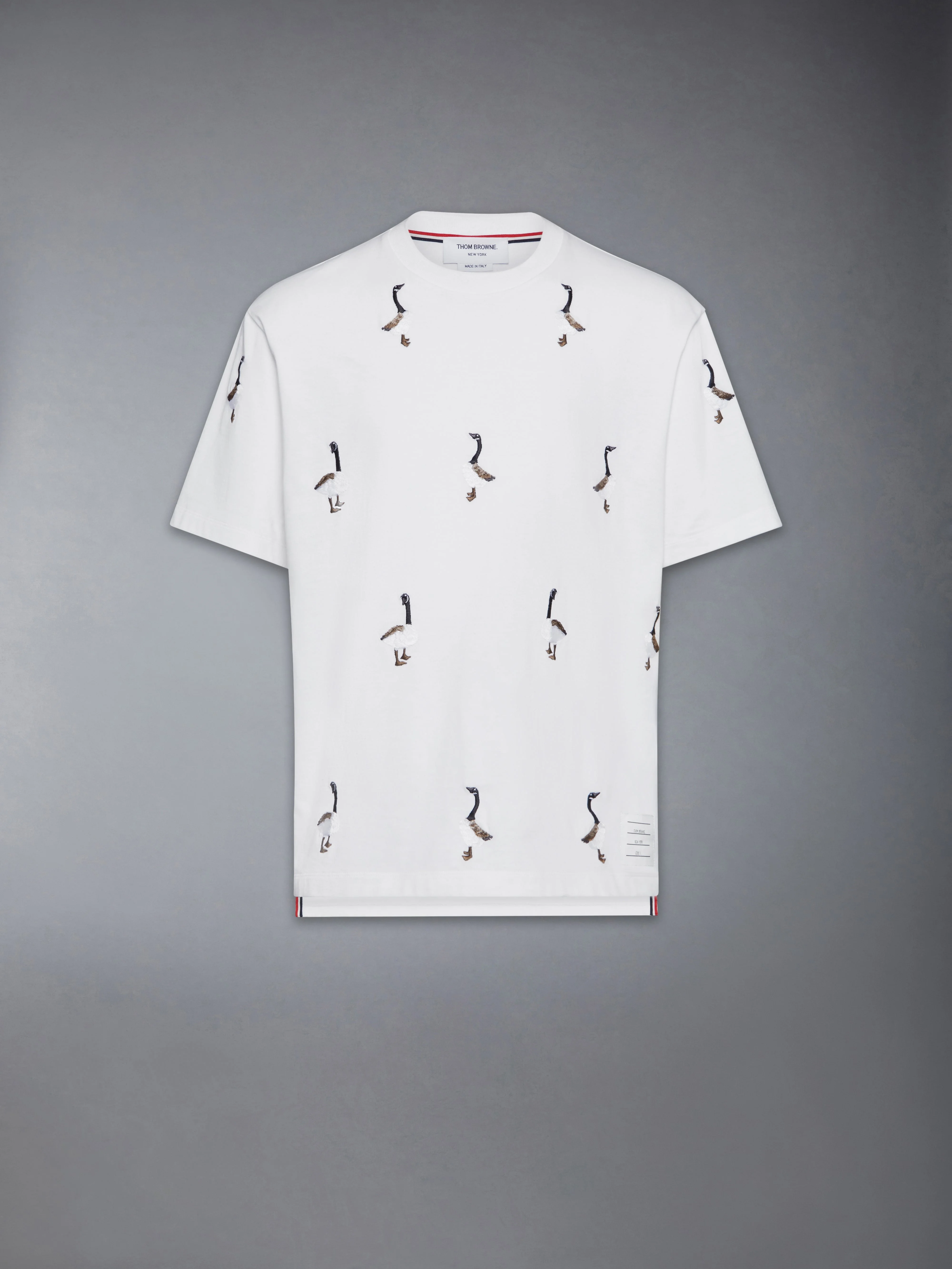 This cotton tee is adorned with a flurry of embroidered geese. Symbolizing migration and change, unity, and the courage to embrace what's next, this evocative shirt is perfect for bringing fresh energy into your seasonal wardrobe. Pair it with our Satin Stitch Goose Utility Shorts. Name tag applique Signature striped grosgrain loop tab Model is 6'1" (185cm), wearing size 1 100% Cotton Made in Italy MJS294E-J0058-100