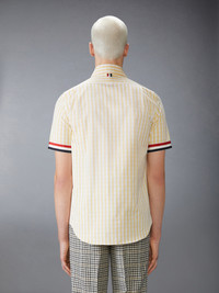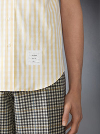 A subtle gingham pattern makes you do a double take—a testament to Thom’s meticulous eye for detail and perfectionism. Elevated with our signature grosgrain trim at the cuffs, this shirt blends classic design with a Thom Browne twist. A sizable chest pocket offers functional storage, while our iconic name tag applique at the hem adds the finishing touch. Front button closure Chest patch pocket Name tag applique Grosgrain trim at sleeves Pleated back yoke with locker loop Signature striped grosgrain loop tab Model is 6'1" (185cm), wearing size 1 100% Cotton Made in Italy MWS245A-F0998-740