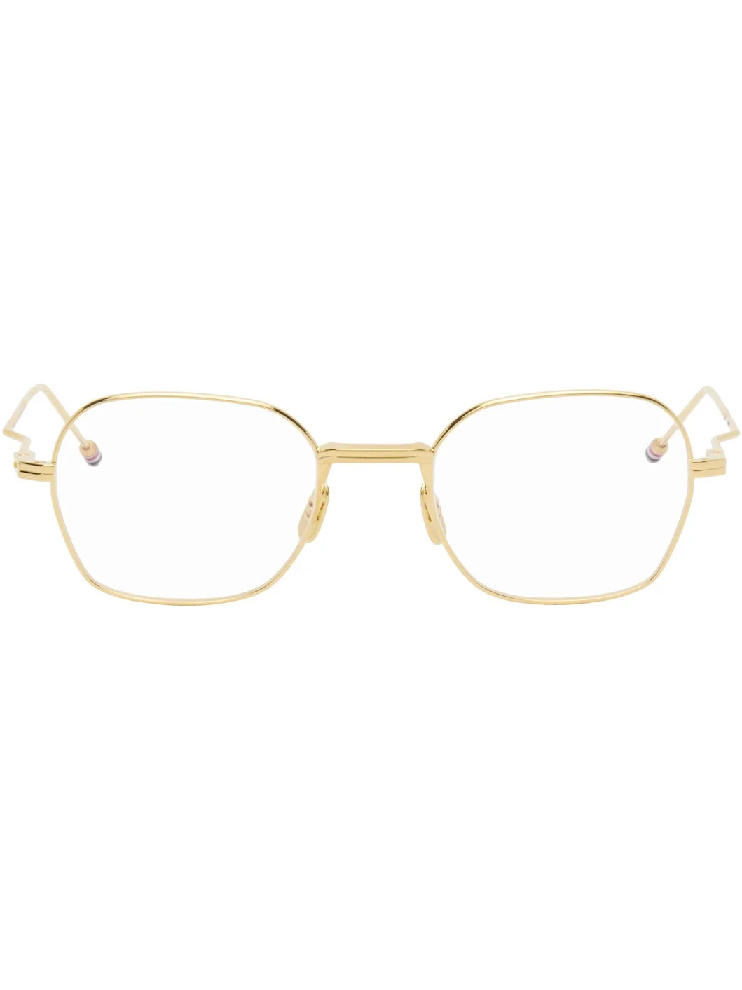 Rectangular titanium-frame optical glasses. · Adjustable metal nose pads · Enameled tricolor stripes at temple tips · Includes case · Size: 48.20 144 Supplier color: Yellow gold Titanium. Made in Japan 252381M133002