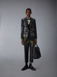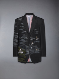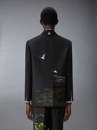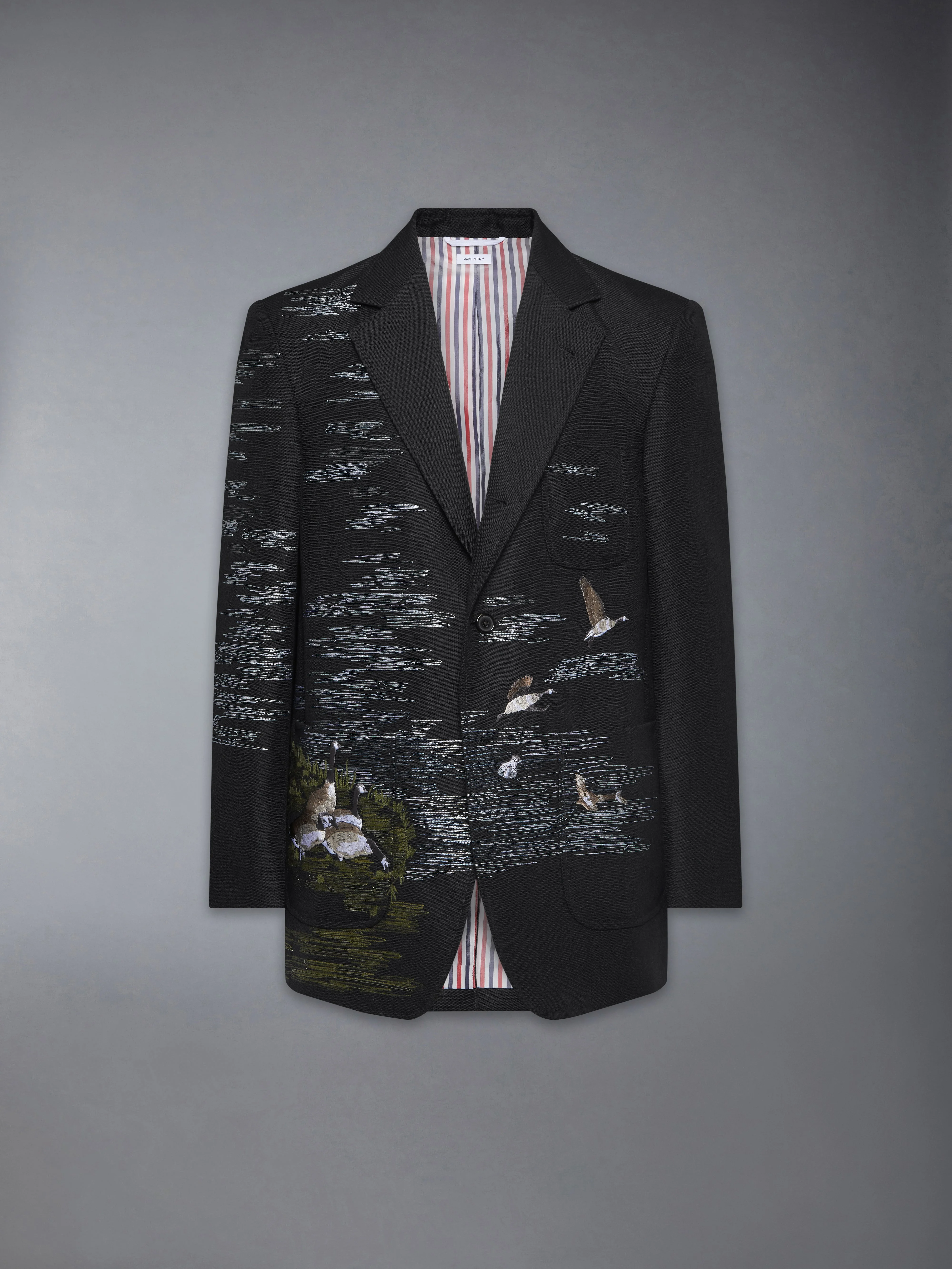 A sport coat that celebrates the promise of new beginnings. Intricately embroidered geese migrate in V-formation amidst blue skies and marshland, symbolizing shifting seasons, hope, and fresh starts. More than just a sport coat, it tells a story—a constant reminder that every new season ushers in possibility, with boundless life waiting beyond the horizon. Complete the suit with our Goose Scenic Satin Stitch Wool Chino Trousers. Front button closure 3 Front patch pockets Buttoned cuffs with signature striped grosgrain trim Signature striped grosgrain loop tab Model is 6'1" (185cm), wearing size 1 100% Cotton Made in Italy MJU568E-E1367-001