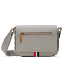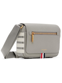 Pebble-grained leather messenger bag in gray. · Adjustable crossbody strap · Zip pocket and logo stamp at face · Tricolor grosgrain flag at face · Stripe appliques at side · Magnetic flap · Patch pocket at interior · Grosgrain lining · H5.5" x W8" x D2.5" Supplier color: Grey Leather. Made in Italy 252381M170005