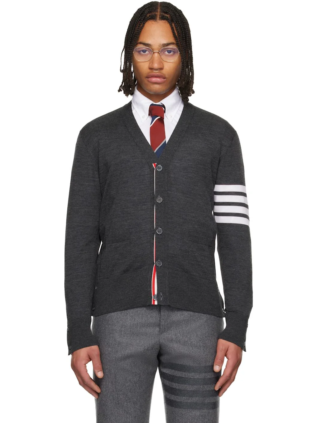 Knit virgin wool cardigan. · Rib-knit Y-neck, hem, and cuffs · Button closure · Welt pockets at front · Button vent at side seams and cuffs · Stripes at sleeve · Tricolor grosgrain flag at back collar Supplier color: Dark grey 100% virgin wool. Made in Italy 261381M200010