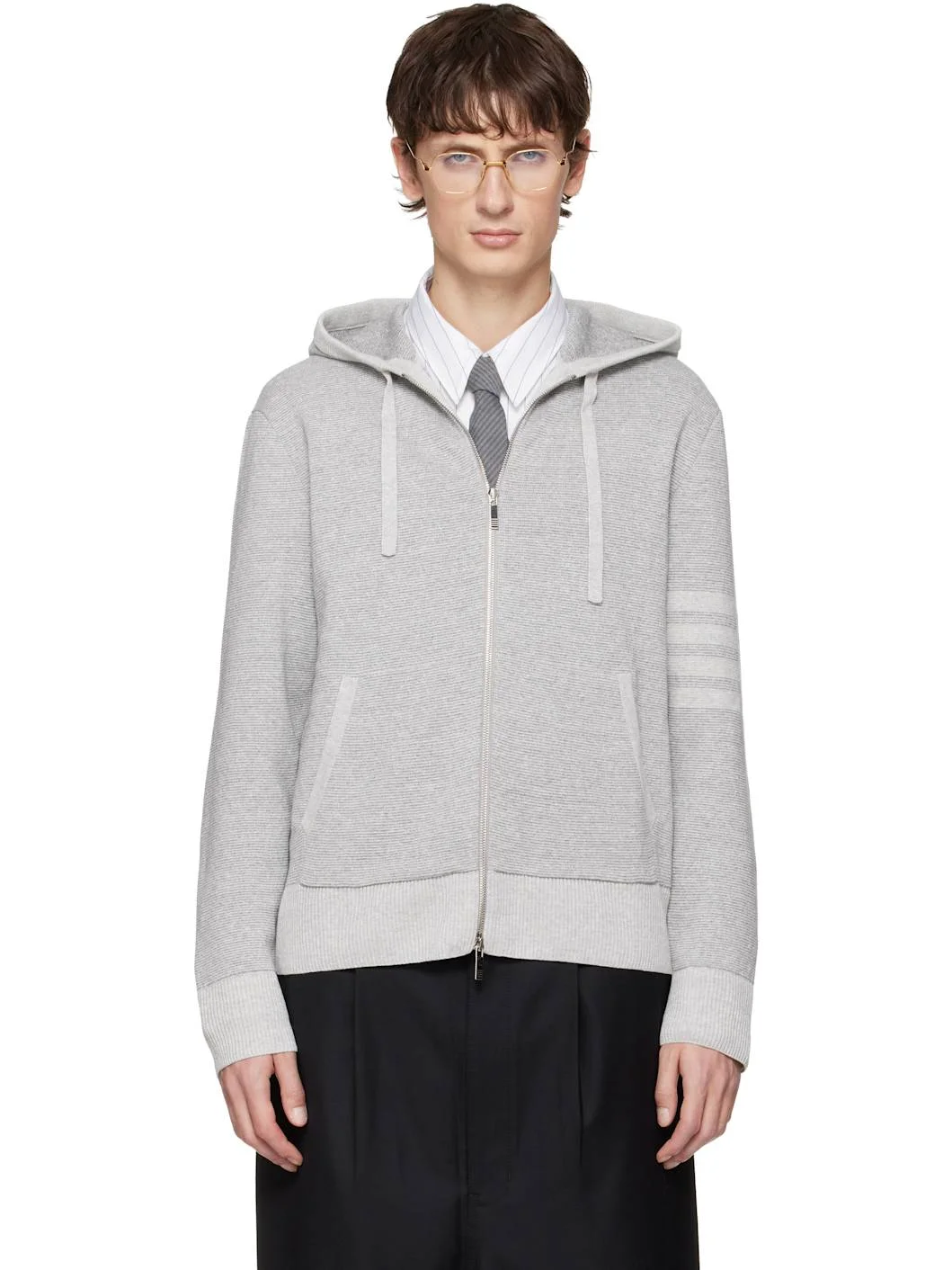 Knit linen- and cotton-blend hoodie. · Drawstring at hood · Two-way zip closure · Welt pockets at front · Rib-knit hem and cuffs · Stripes at sleeve · Tricolor grosgrain flag at back collar Supplier color: Tonal grey 68% linen, 32% cotton. Made in Italy 252381M202003