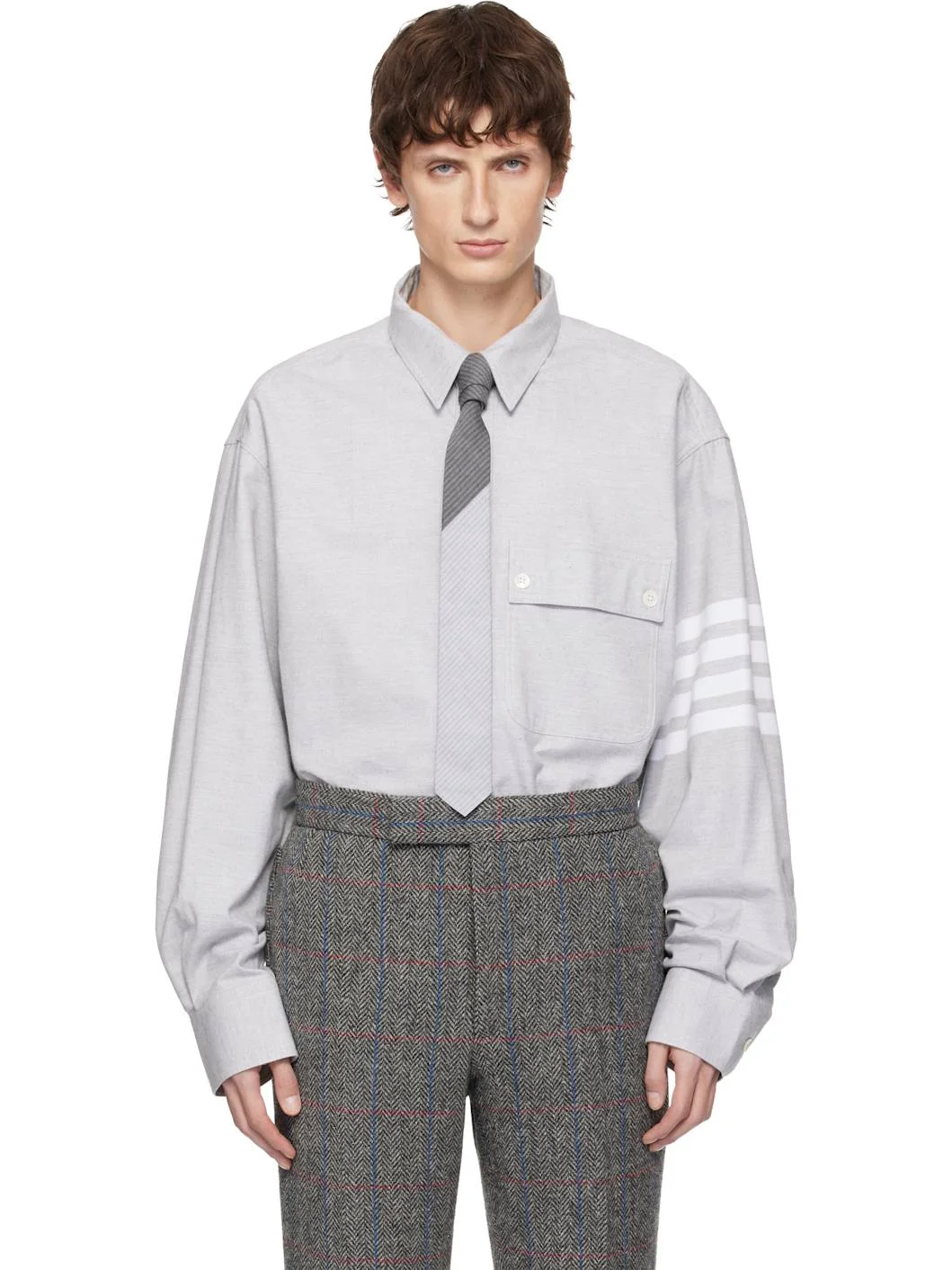 Oversized cotton flannel shirt. · Spread collar · Button closure · Flap pocket at chest · Logo patch at front · Shirttail hem · Dropped shoulders · Stripes at sleeve · Pleats at button cuffs · Tricolor grosgrain flag at back collar · Locker loop at back yoke Supplier color: Med grey 100% cotton. Made in Italy 252381M192034