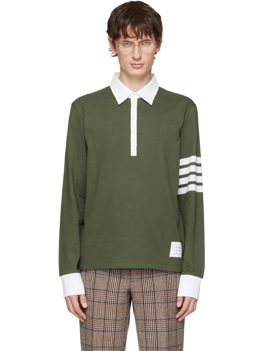 Cotton jersey polo. · Spread collar · Five-button placket · Logo patch at front hem · Button vent at side seams · Stripes at sleeve · Rib-knit cuffs · Tricolor grosgrain flag at back collar Supplier color: Dk green Body: 100% cotton. Trim: 97% cotton, 3% elastane. Made in Italy 252381M212017