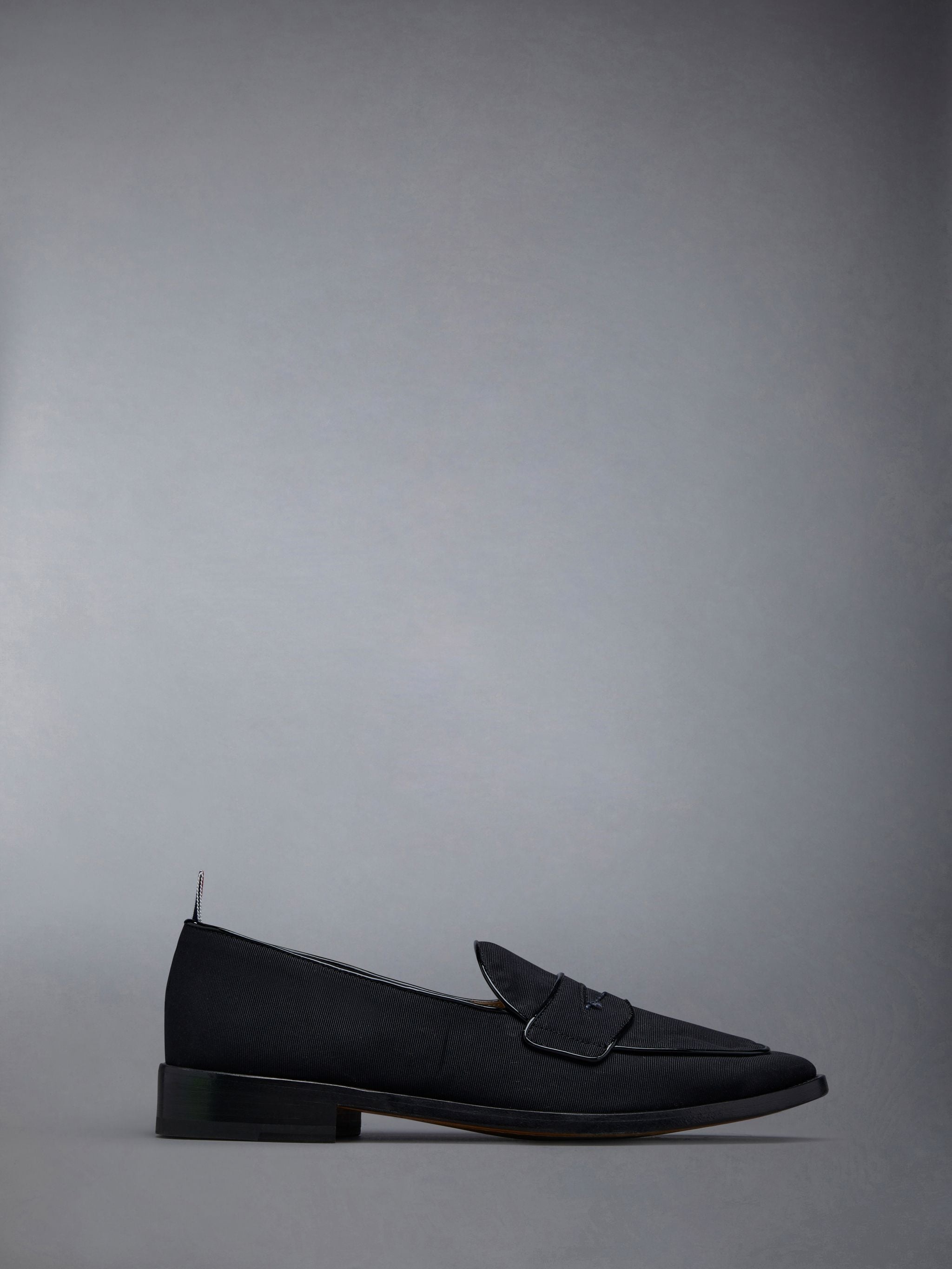 DETAILS & FIT Varsity penny loafer in black grosgrain with flexible tonal leather sole. Apron toe, penny loafer strap, black leather piping details. Leather insole and lining. Signature striped grosgrain loop tabs at heels. Upper:100% Viscose Sole: 100% Calf Leather Lining: 100% Calf Leather Made in Italy MFL087AF0311001